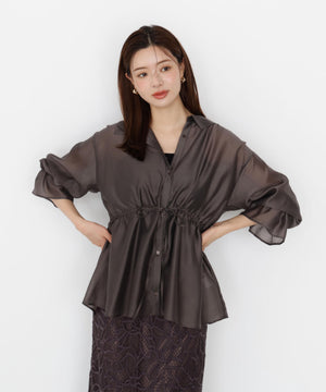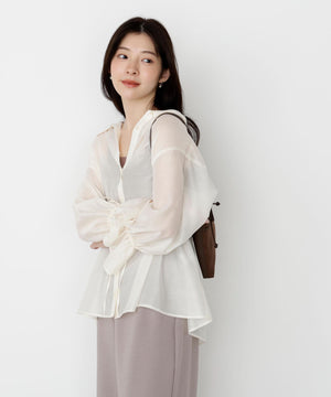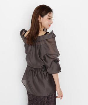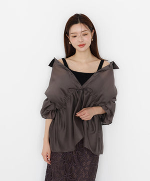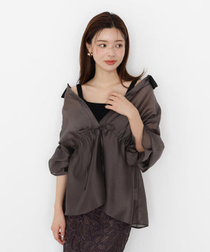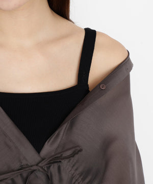チュニック丈のシャツ&ニットキャミのアンサンブルです。レイヤードで着るときに、シャツとインナーのニットを釦で留めてから、肩を落とすとオフショルシャツとしても着こなせます。それぞれ単品でも着回せる便利なデザイン。シャツは羽織りとしても活躍します。