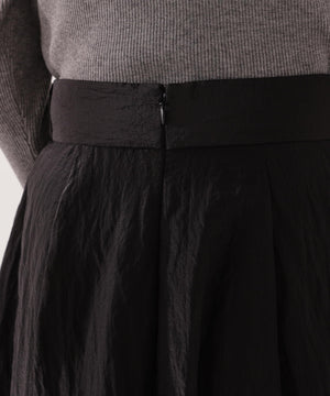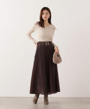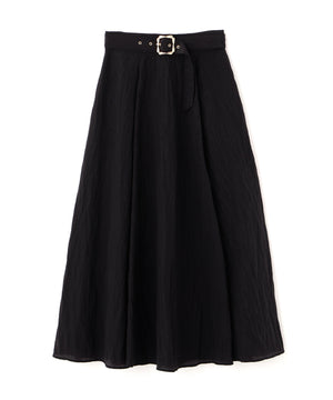 独創的なゴールドカラーのバックルが存在感のあるフレアスカートです。表面感のあるナイロン素材を使用しており、動くたびに華やかな印象を演出。ベルト穴もゴールドカラーの金具を合わせてカジュアルダウンしているため、かしこまりすぎず、デイリースタイルに着用いただけます。