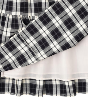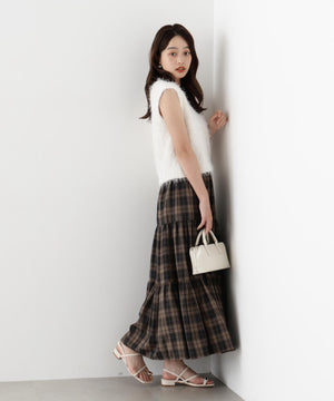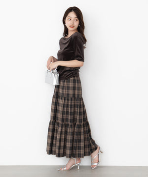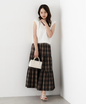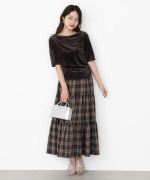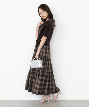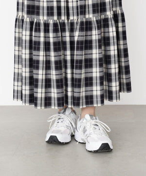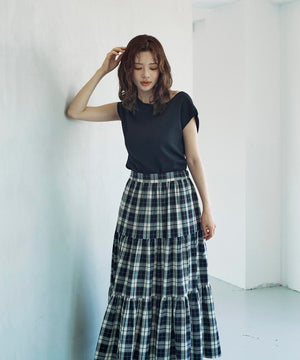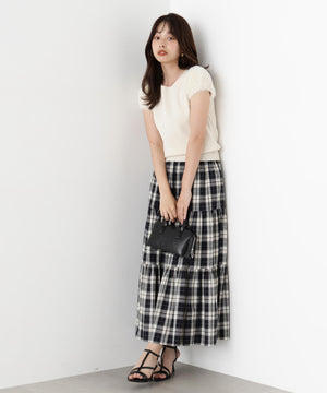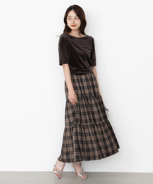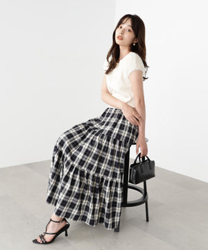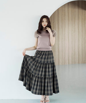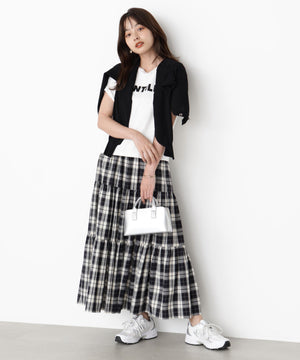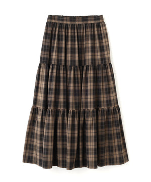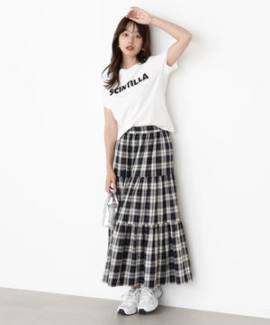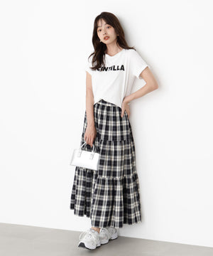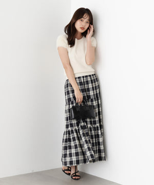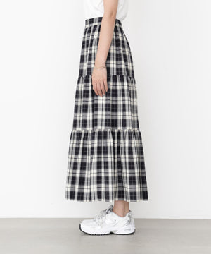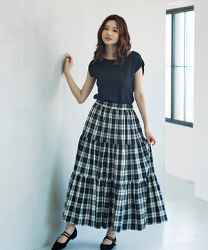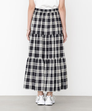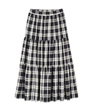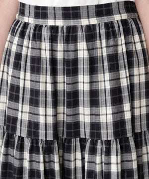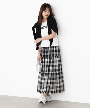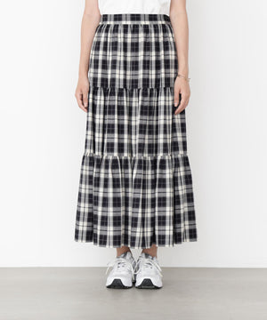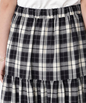 トレンドのチェック柄がアクセントになるティアードスカートです。ボリュームを抑えているので、着ぶくれぜずに動きやすいデザイン。ウエスト前はすっきりと切り替え、後ろはゴム仕様でフィットします。重すぎない生地感なので、暑い時期から季節を先取りしたコーディネートが楽しめます。