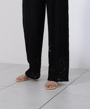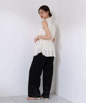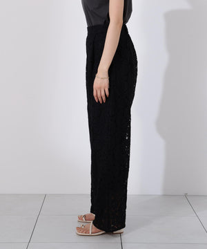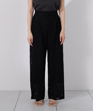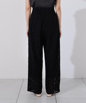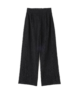 存在感のあるレースが目を引くワイドパンツは、短丈トップスと相性バツグン。後ろウエストはゴム仕様と裾幅が広すぎないシルエットなので穿きやすい一本。裏地付きなので安心して着用いただけます。