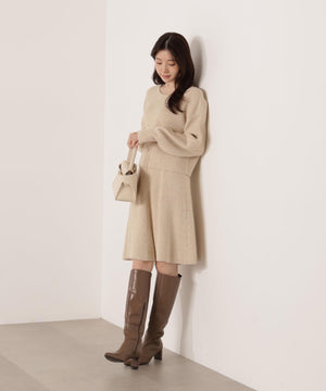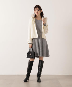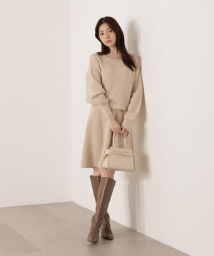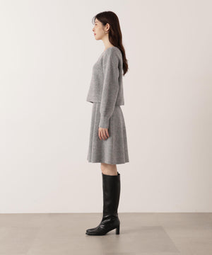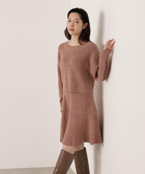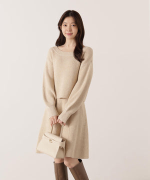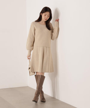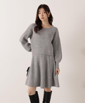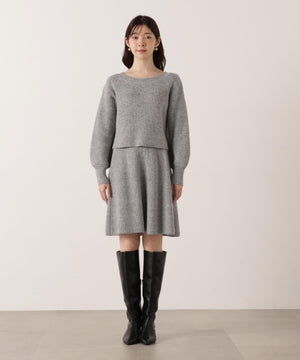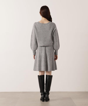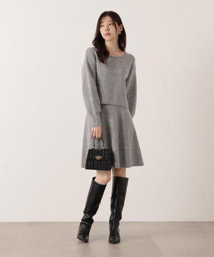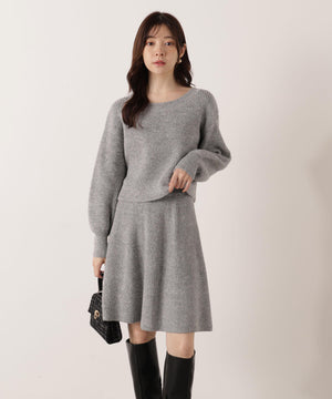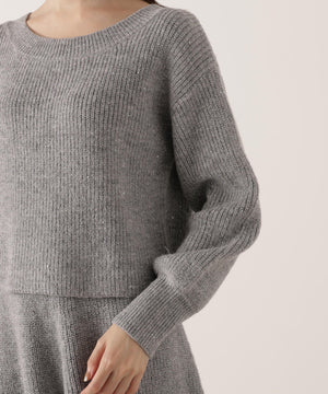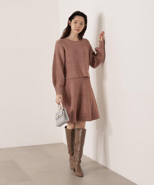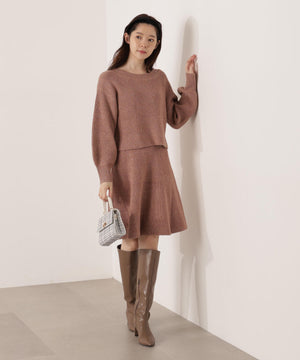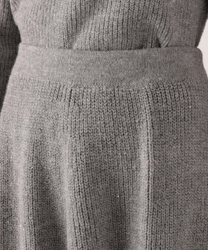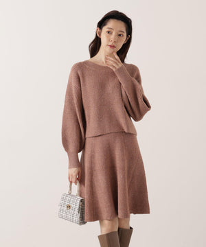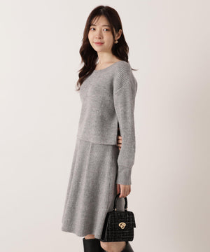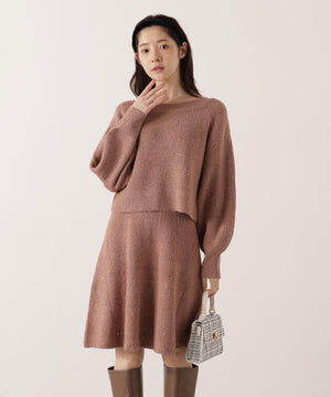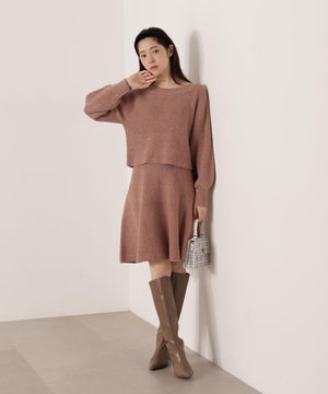 スパンコール入りの糸を使用した大人かわいい畦ニットアップ。セットアップでニットワンピース風に着られるデザインです。短丈シルエットのトップスは、お持ちのアイテムと着回せるのも魅力。ミニスカートは短すぎない着丈なので安心して着用いただけます。