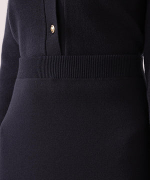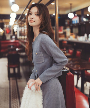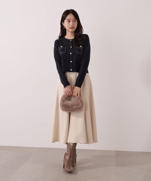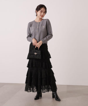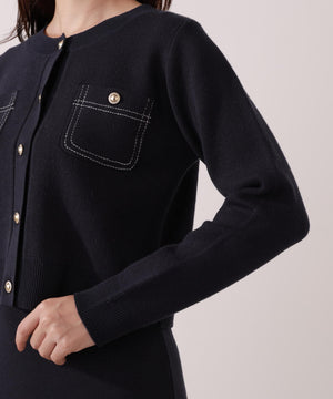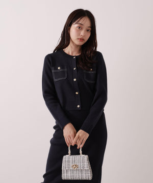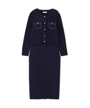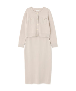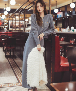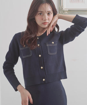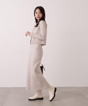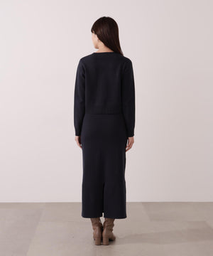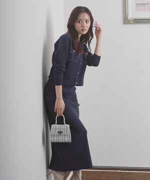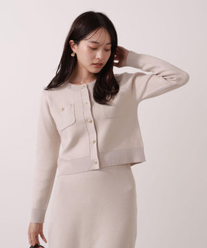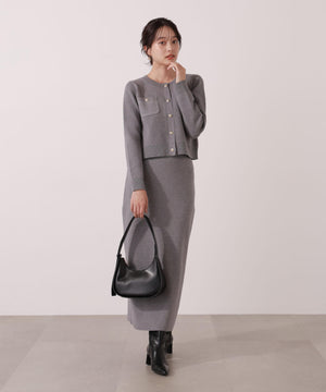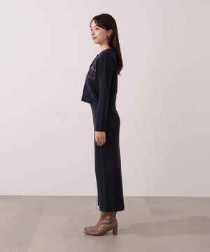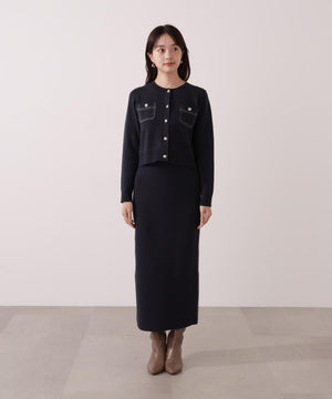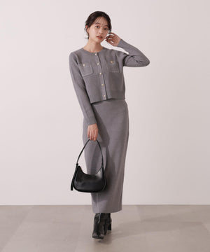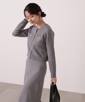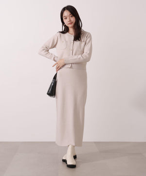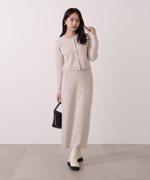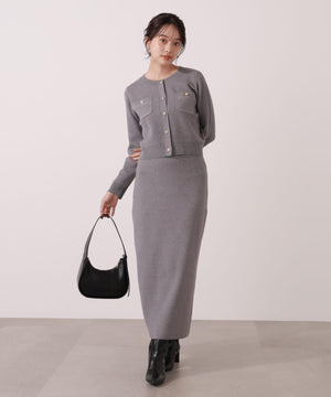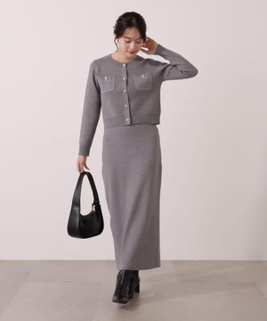胸ポケットにステッチ刺しゅうをあしらったカーディガンが大人可愛いニットSET UP。カーディガンとスカートの2点セットは、それぞれ単品使いもできます。飽きのこないベーシックなデザインは着回し力バツグン。スカートは後ろセンタースリット入りです。