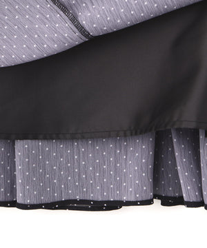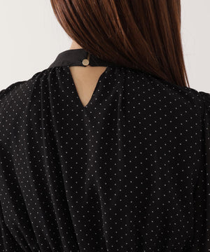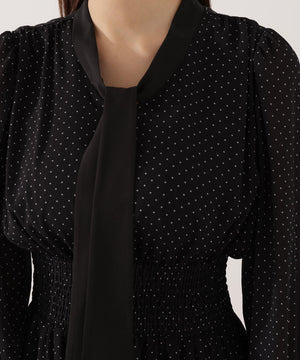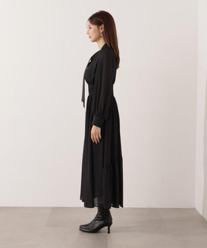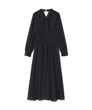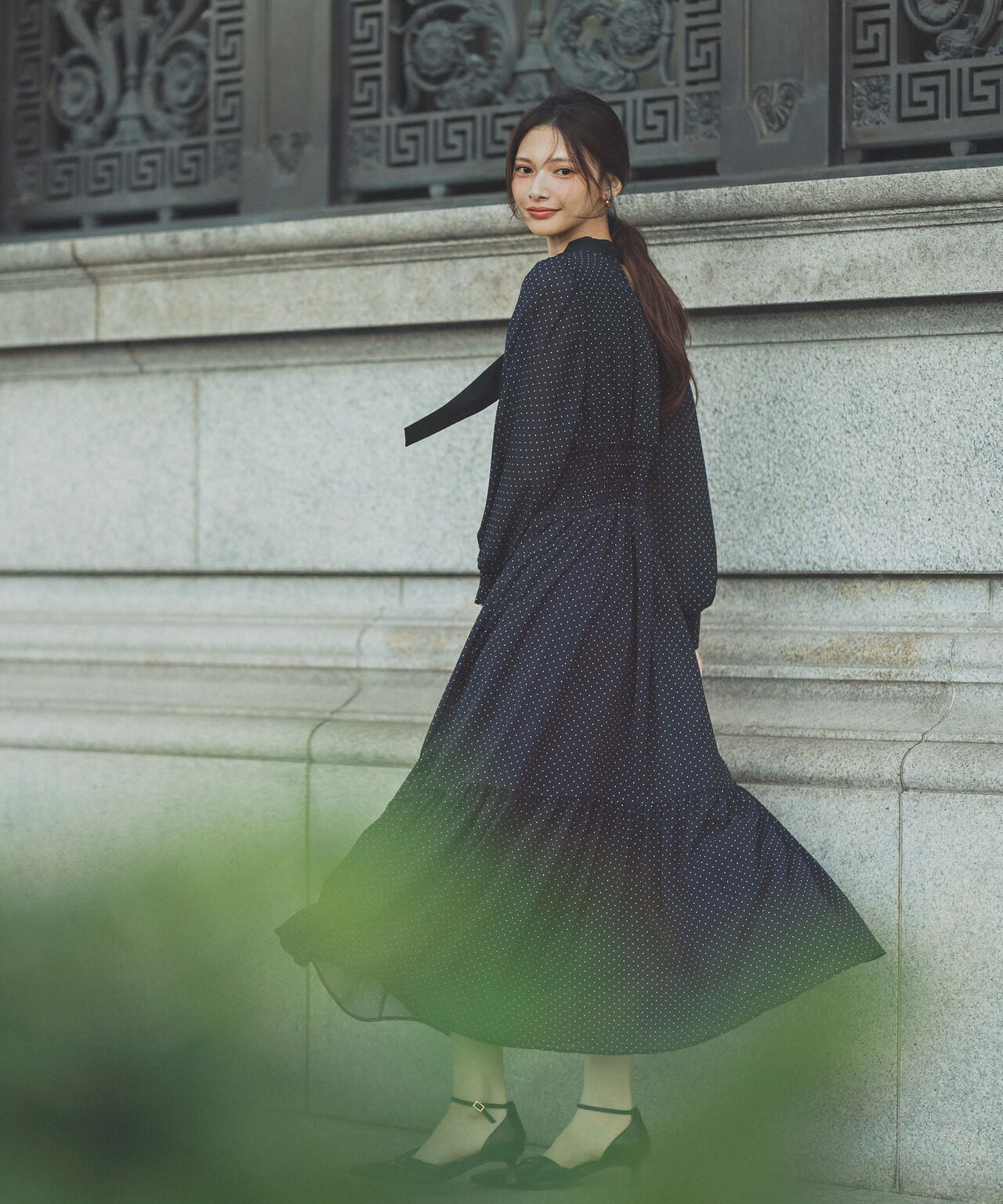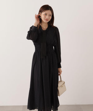大人っぽいボウタイが映えるワンピースです。ひと巻きして垂らしたボウタイがアクセントになります。ウエストはシャーリングゴムによって着心地の良さと女性らしさをプラス。バックスタイルのティアード切り替えがオシャレ見えするデザインです。ドット柄のブラック、無地グレーとピンベージュの3色展開です。