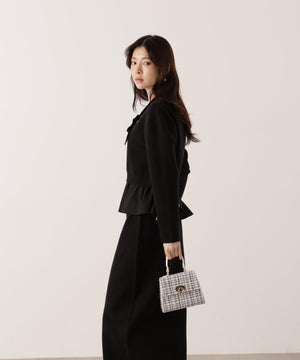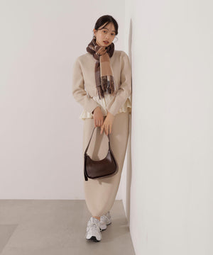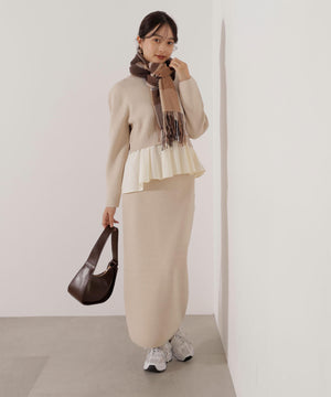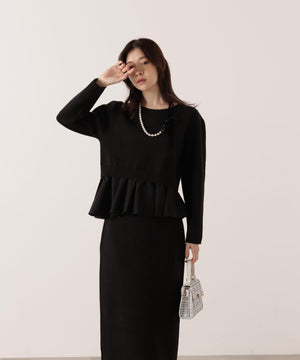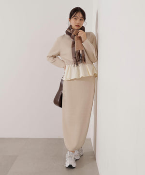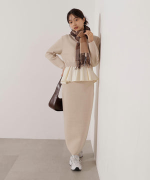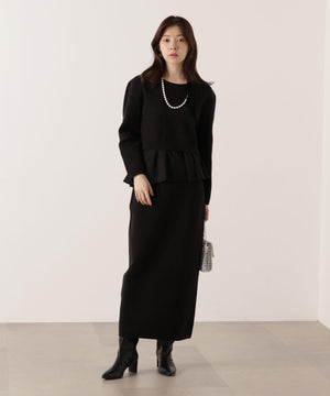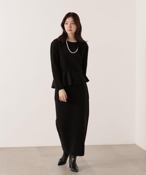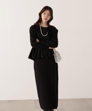 暖かみとスタイリッシュなデザインを両立したペプラムニットとニットナロースカートのセットアップ。ペプラムニットはイレギュラーヘムなので、裾に動きが出ておしゃれ感がアップします。ウォーム感のある素材を使用しているので、寒い時期でも着やすいです。SETUPでワンピース風にも、それぞれ単品使いもしやすいアイテムです。