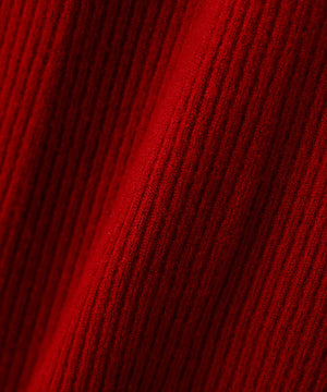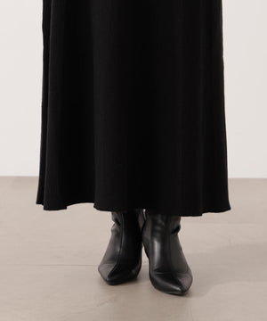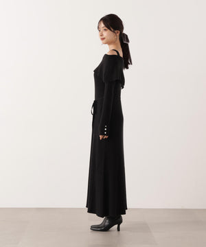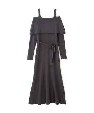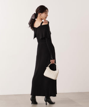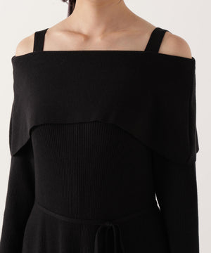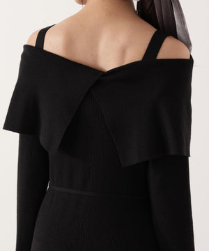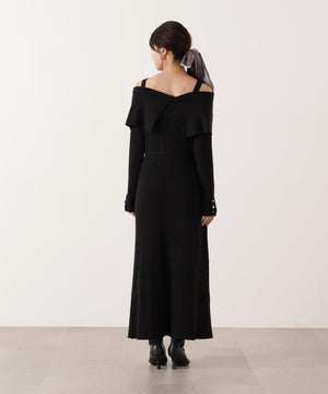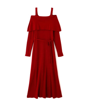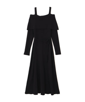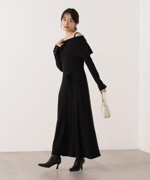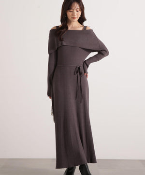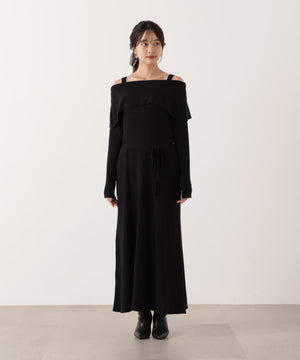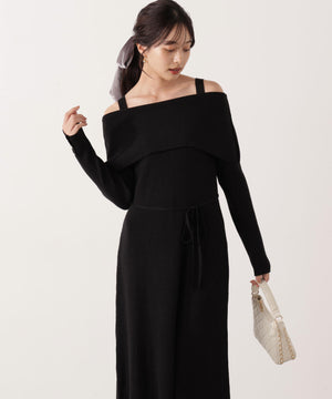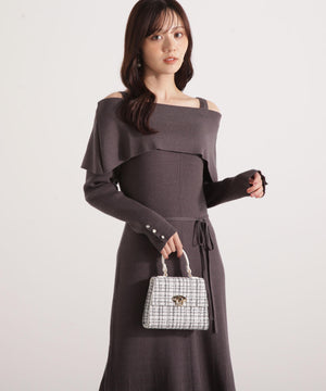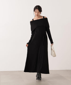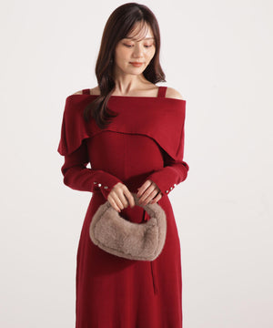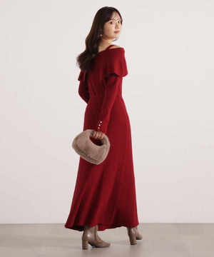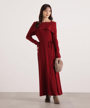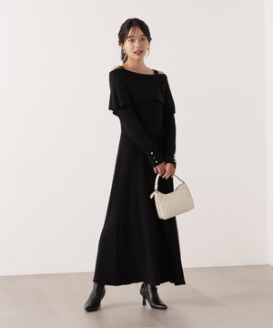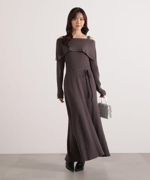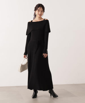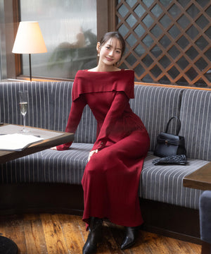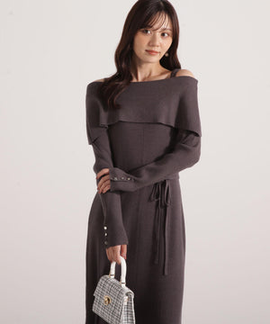 冬の肌見せを大人っぽく叶えるオフショルニットワンピース。オフショルが肩から落ちないよう設定しつつ、肌の露出をおさえたデザインです。袖口に付けたきらっと釦がアクセント。体のラインを拾いすぎず、キレイなラインを作るシルエットになっています。足元はブーツ合わせがお勧めです。
