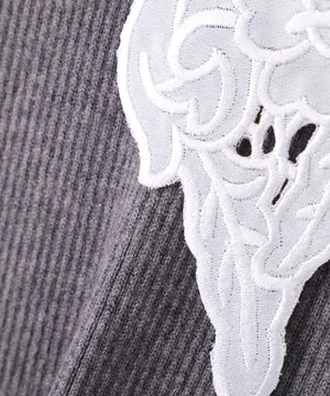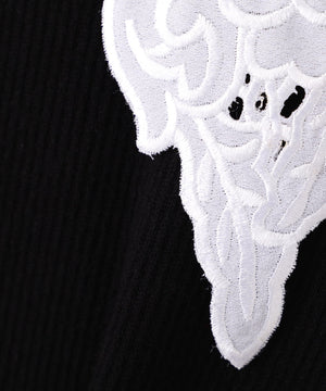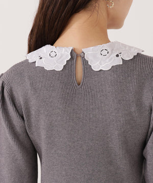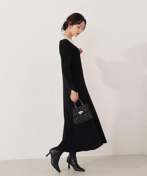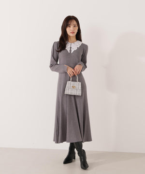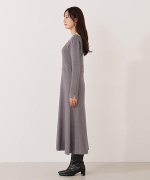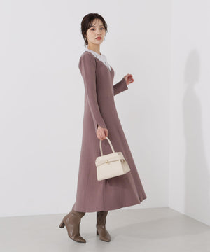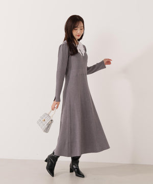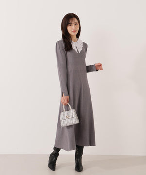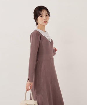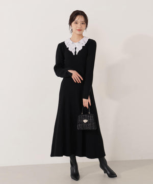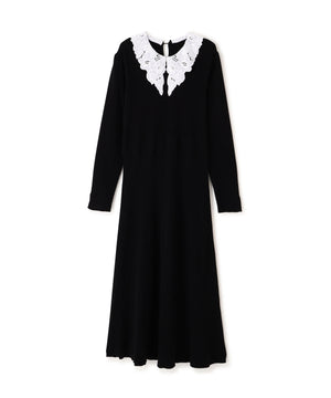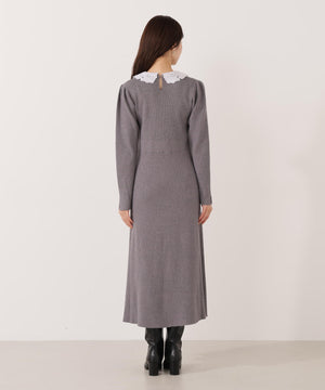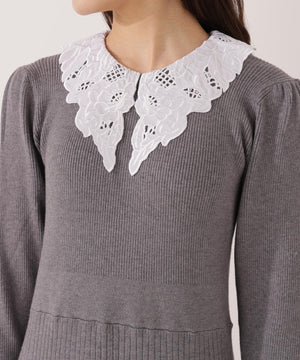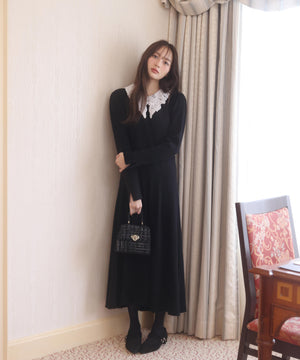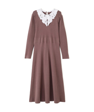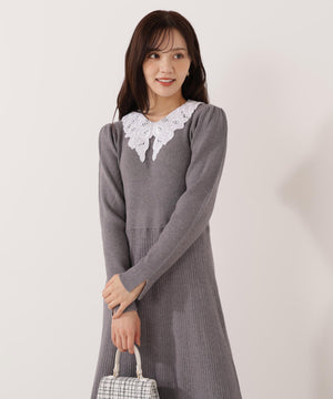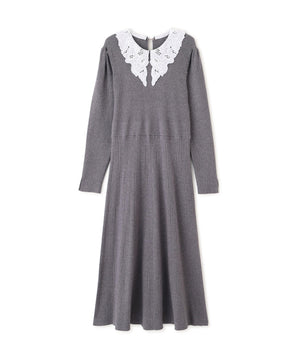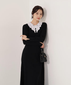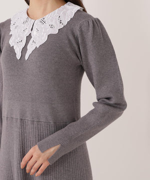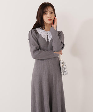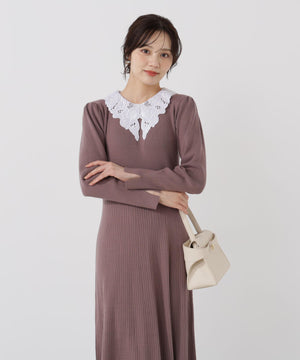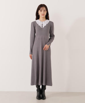 オリジナルのレース襟がポイントのニットワンピース。トレンドのレース襟は存在感があり、一枚で様になるデザインです。袖口はスリット入りで手元に抜け感をプラス。リブ編みなので程よく体のラインにフィットしながら、ウエストから広がるフレアラインをキレイに演出してくれます。