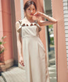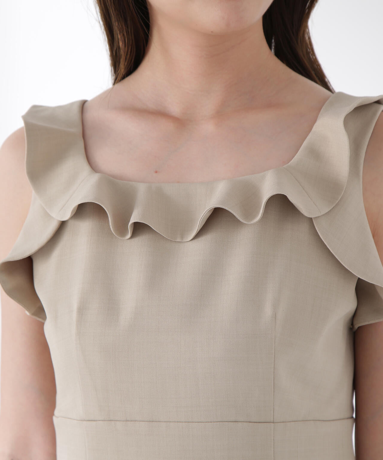 大きく開けた襟まわりにラッフル使いが映えるワンピース。ウエスト位置を高めに切り替えているので脚長効果を期待できます。すっきりとしたナローシルエットの後ろはセンタースリット入りで足さばき良く、後ろウエストはゴム仕様なので着心地も良いです。カーディガンを肩掛けしたり、バッグなどの夏小物を取り入れるのもお勧めです。