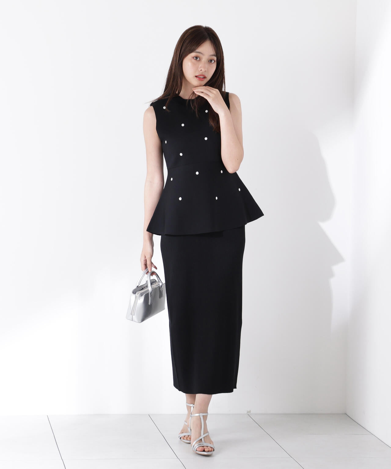 ドット刺しゅうがオトナ可愛いニットアップです。ペプラムトップスにドット刺しゅうを施し、シンプルながら華やぎアップ。単品使いでデニムパンツと合わせるのもオススメです。縦ラインを強調しながら、女性らしさとカジュアルな雰囲気も出せる万能セットアイテムです。