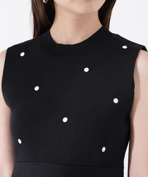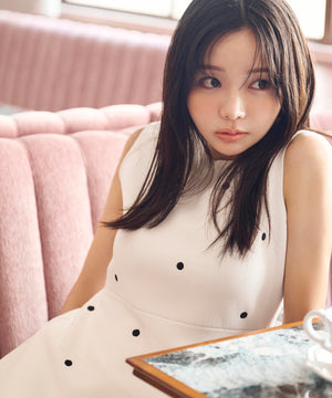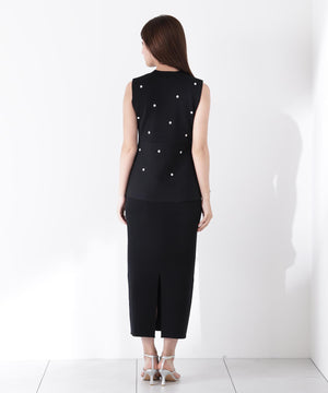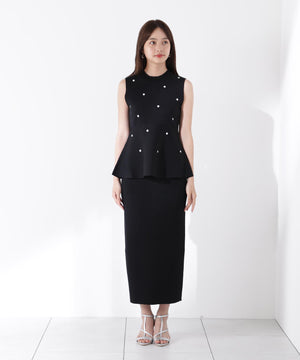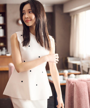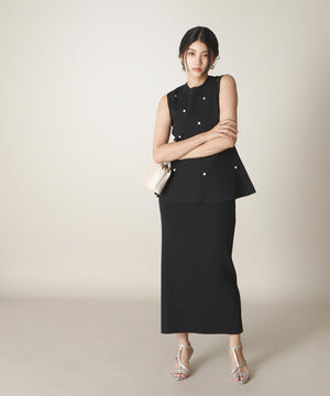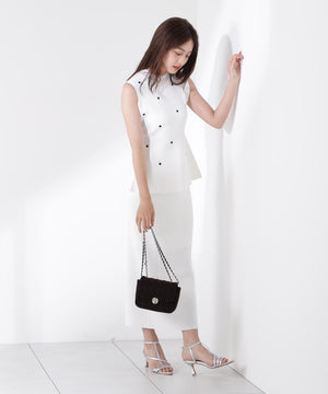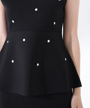 ドット刺しゅうがオトナ可愛いニットアップです。ペプラムトップスにドット刺しゅうを施し、シンプルながら華やぎアップ。単品使いでデニムパンツと合わせるのもオススメです。縦ラインを強調しながら、女性らしさとカジュアルな雰囲気も出せる万能セットアイテムです。