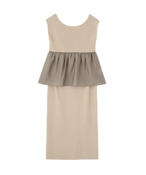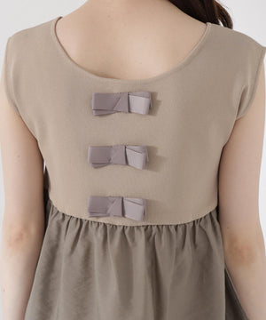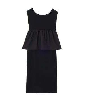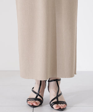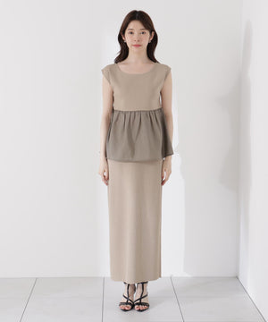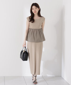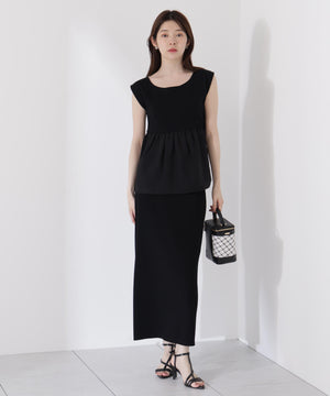 接触冷感を備えたニットを使用した、トップスとスカートのニットアップです。体をしめつけないトップスは、異素材のペプラムシルエットとバックリボンが、オトナ可愛いデザイン。縦ラインを強調するスカートを合わせれば、旬なスタイリングが叶います。
