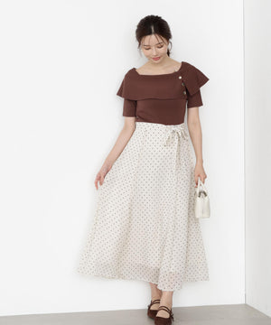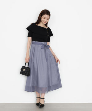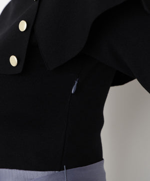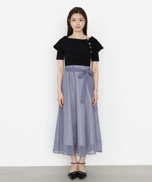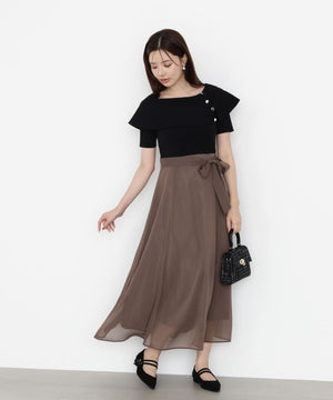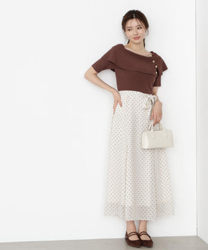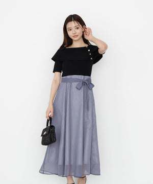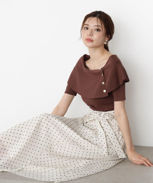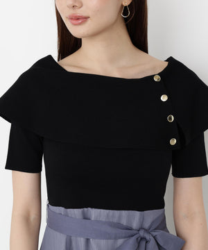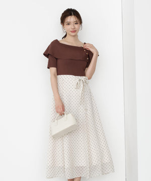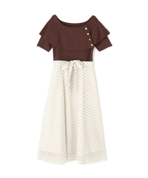 ケープ見えするニットがオトナかわいいドッキングワンピースです。ケープ風ニットに付けた品の良いボタンがポイント。涼しげなシフォン楊柳素材を使ったスカートは、リボンでウエストマークでき、動きやすさと女性らしい雰囲気を演出。1枚でコーディネートを組んだような素材とデザインも魅力です。