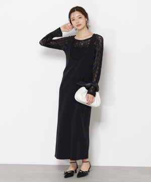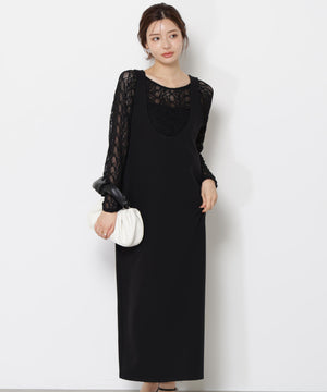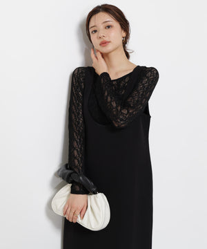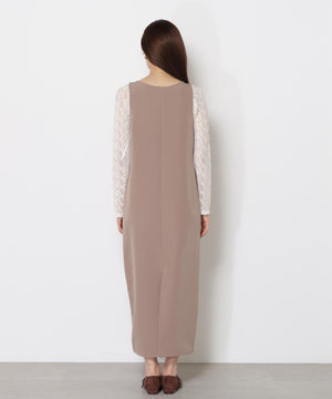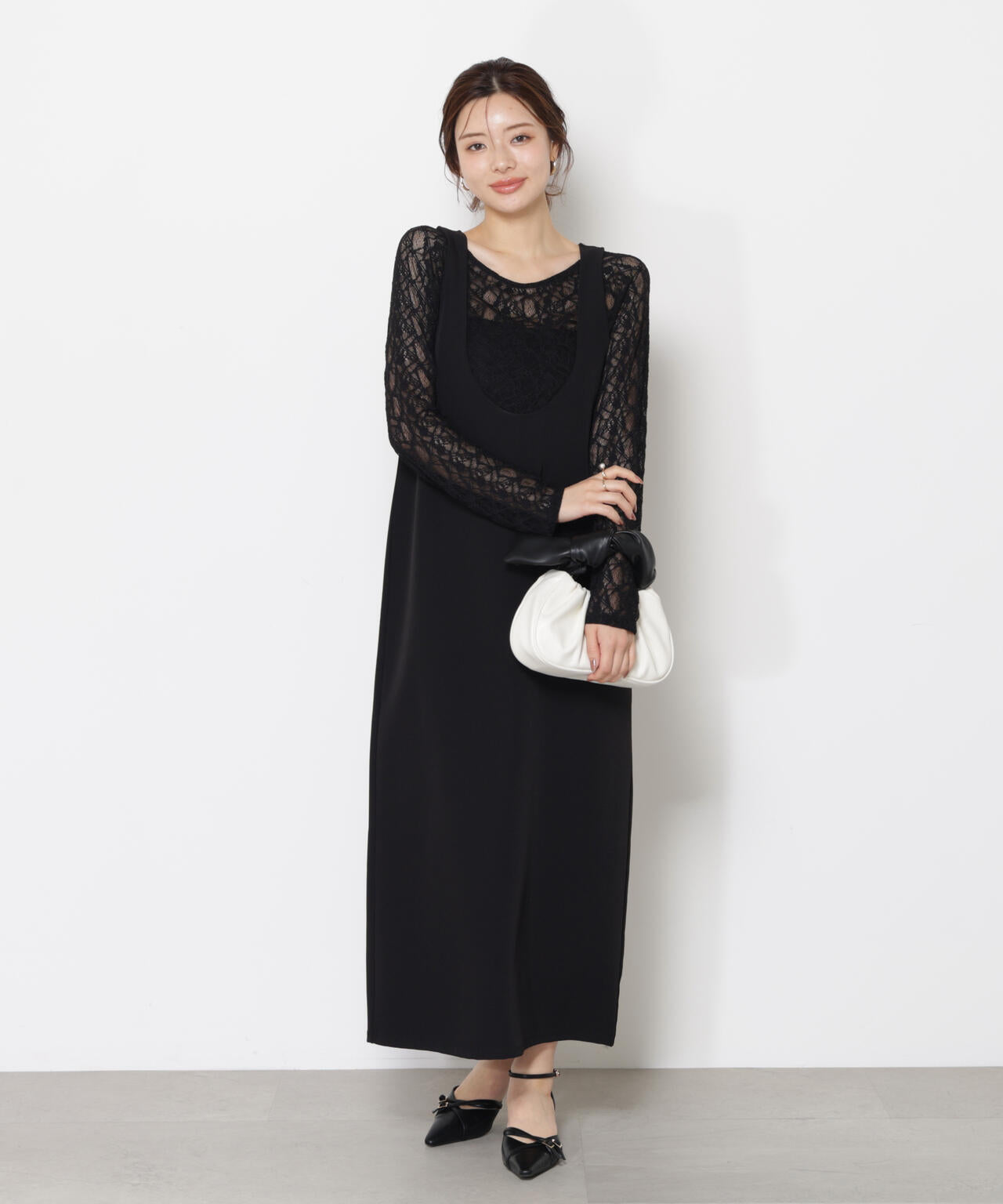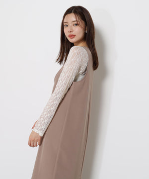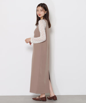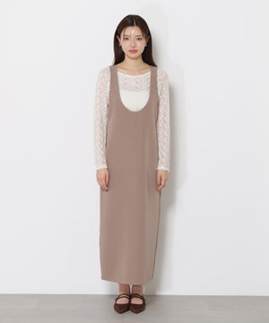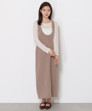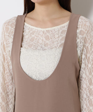 レースインナー×Uネックジャンパースカートのセットアイテムです。すっきりとしたバランスで着られるデザインにし、女性らしさと上品さも両立。レースインナーは、デコルテラインをキレイに見せてくれます。ジャンパースカートは、深いUネックが縦ラインを際立たせて、すっきりとした印象に。ウエスト位置を高めにしているので、キレイなシルエットを叶えます。後ろはスリットが入っているため足さばきも良いです。