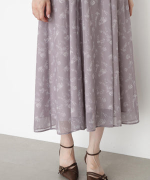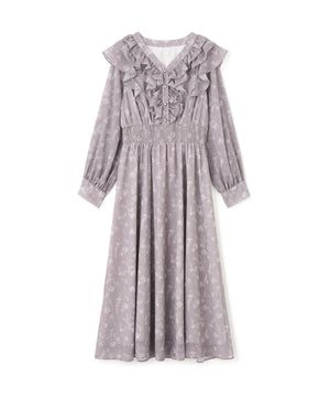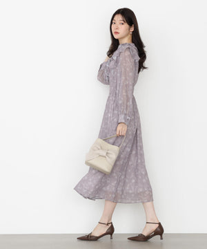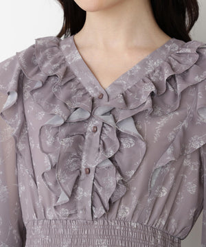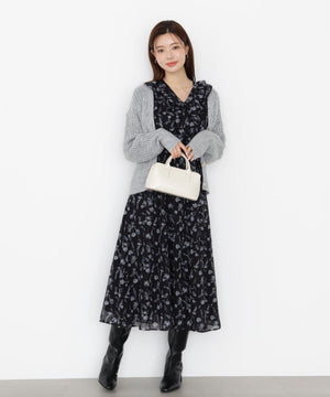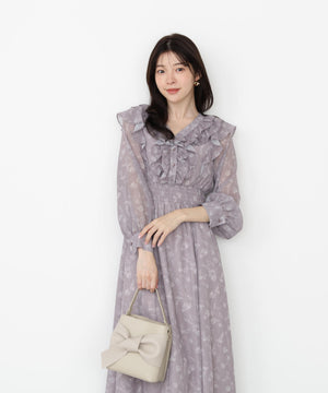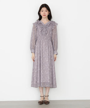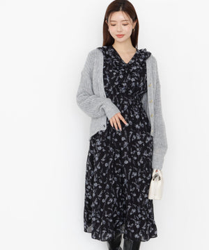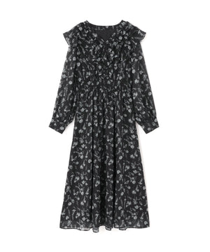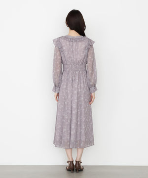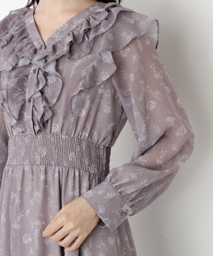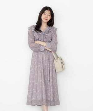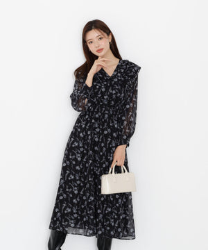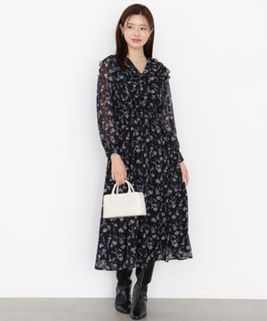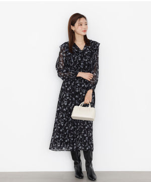 ラッフルフリルが顔まわりを華やかに見せてくれる花柄ワンピースです。オリジナルのフラワー柄を使用。袖は裏地がなく、身頃とスカート部分は裏地を付けています。ウエストはゴム仕様なのでシルエットにメリハリを付けながら、着心地の良さも両立。カーディガンやジャケットを羽織ると長く着ていただけます。