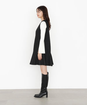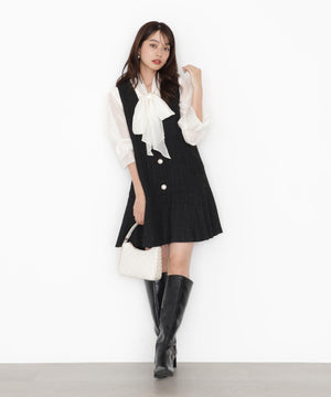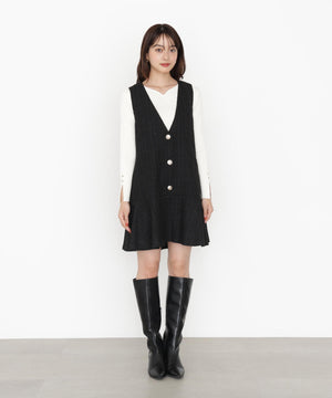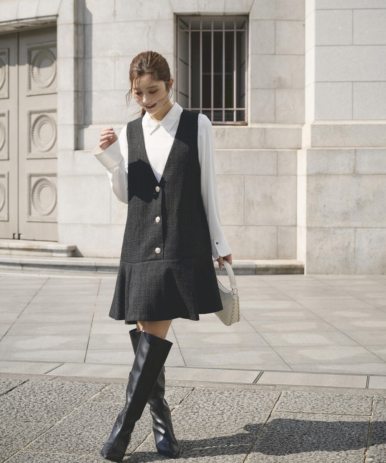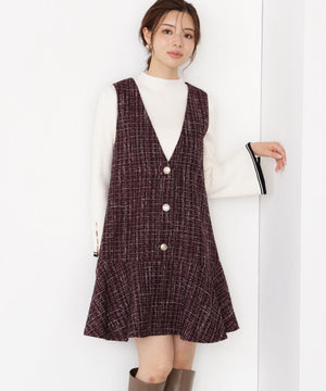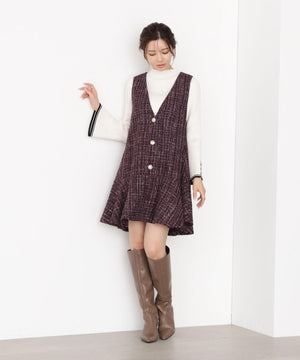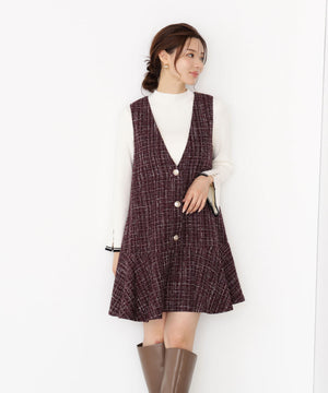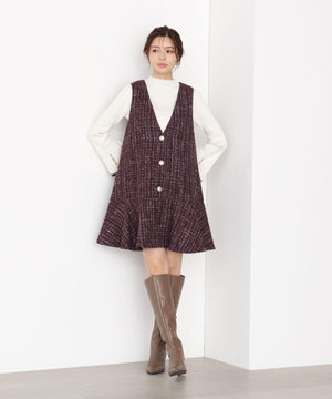 ラメ糸が入っているツイード素材を使ったフェミニンな雰囲気のミニ丈ジャンスカです。ライトゴールドカラーの釦がポイントで、甘くなりすぎず上品な印象に見せてくれます。中はボウタイブラウスやニットなど、合わせるインナーによってコーディネートの幅が広がります。