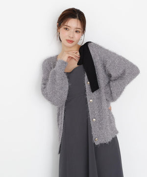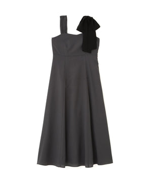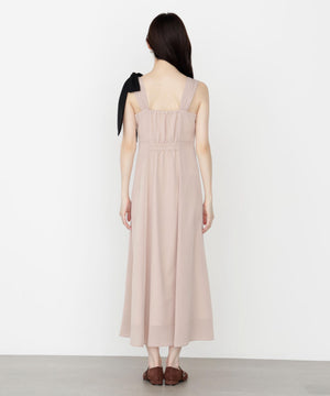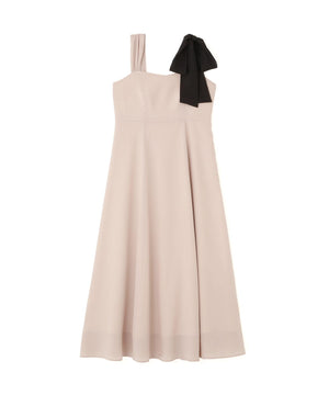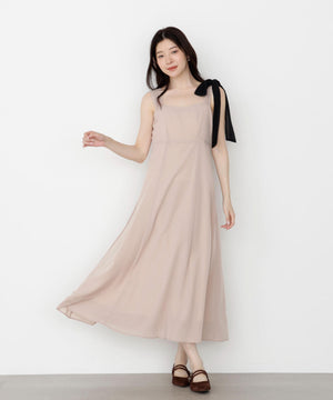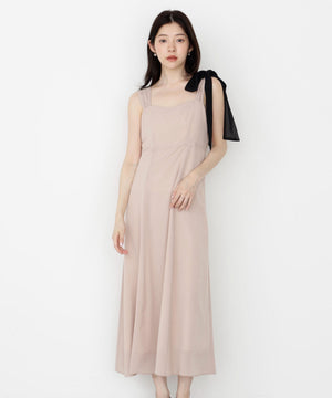 透けすぎないシフォンジョーゼット素材を使い、ふわっとしたシルエットに仕上げたキャミワンピースです。アシンメトリーな肩リボンがキャッチーなデザイン。配色の効いたショルダーリボンは取り外しが出来るので、カーディガンなどを羽織りやすくなっています。