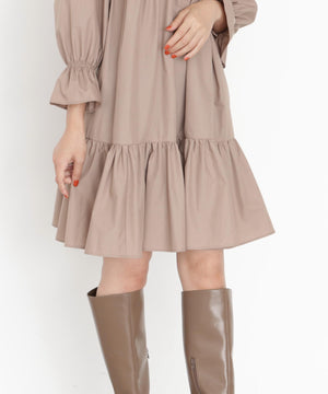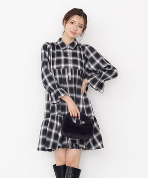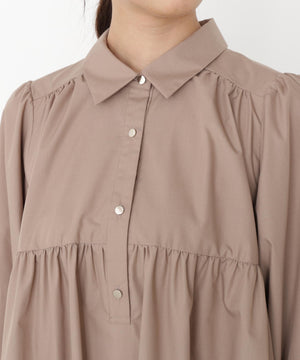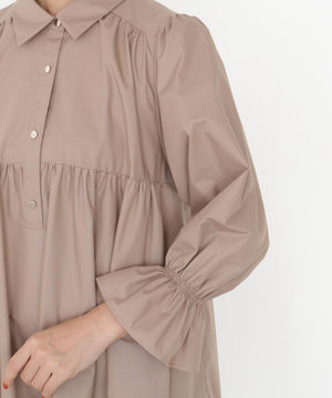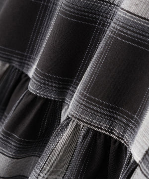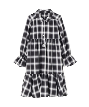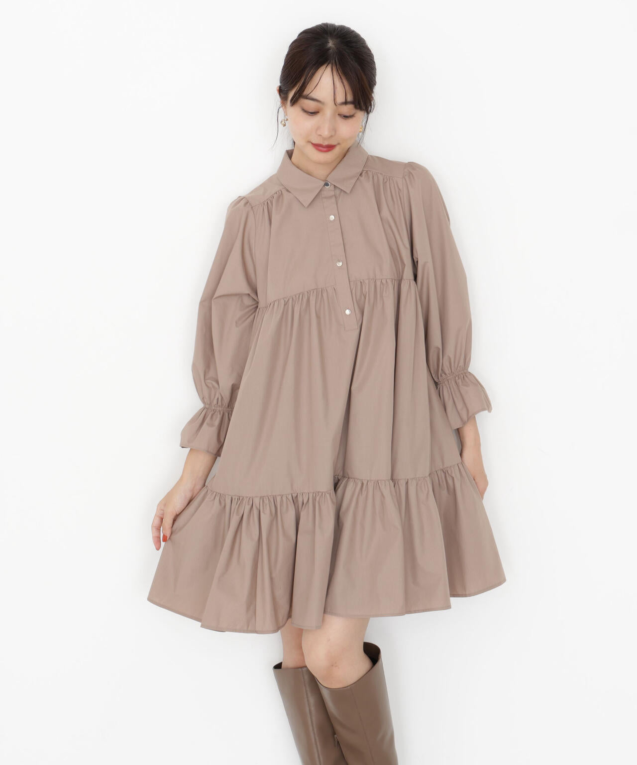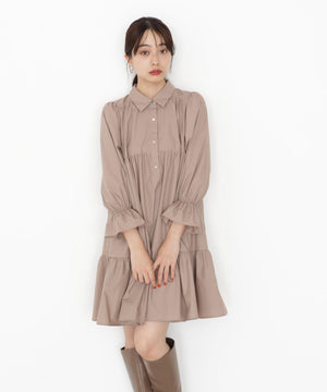 ボリュームのあるティアードシルエットが愛らしいミニ丈のシャツワンピース。ふんわりとした女性らしいシルエットに、金色ボタンが上品なアクセントになります。ゆるっとカーディガンを羽織ったり、秋冬素材のジレとのレイヤードもおすすめ。無地ベージュとトレンドのブラックチェックの2色展開です。