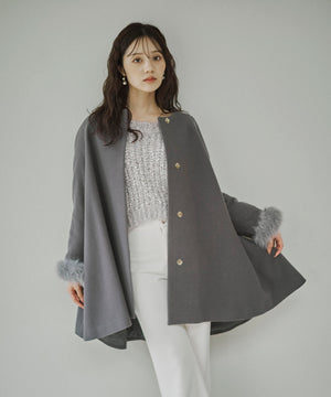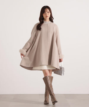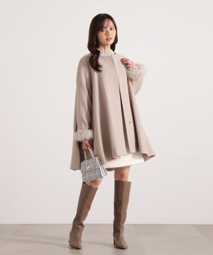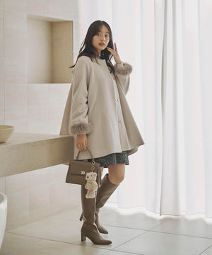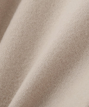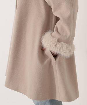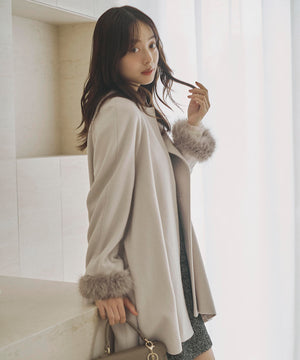 日本の尾州エリアの厳選されたウールを使用。上質な繊維の細かい糸を使用しており、柔らかく、膨らみもある上品なウール混素材です。日本製の生地を使用しています。袖口はフェイクファーを使用。