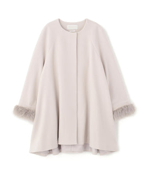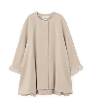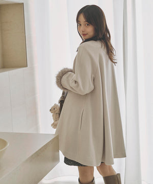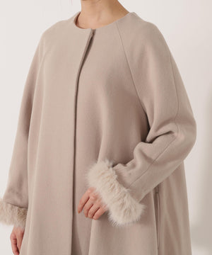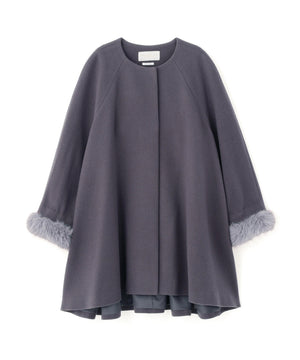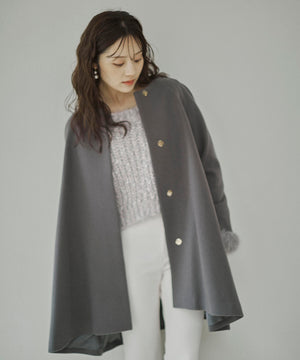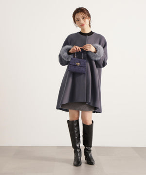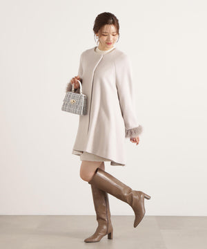 洗練された印象を叶えるノーカラーコート。ミドル丈の裾はゆるやかに前後差を出したヘムラインで、動きのあるシルエットを演出。袖口のフェイクファーは取り外し可能、シーンに合わせてアレンジが楽しめます。前立てにエレガントなドット釦を付けており、前を開けた時にさり気ないアクセントをプラス。ミニスカートやナロースカート、パンツ合わせもお勧めです。