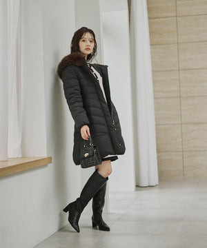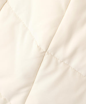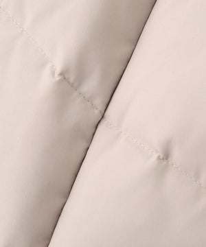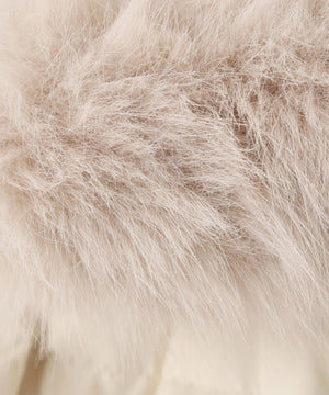 フランス製のダウンを使用。空気を多く含み保温性に優れています。表生地は撥水加工されています。ダウンの膨らみを感じられる様に、表生地は高密度ですが、ソフトで軽量感のあるタフタ素材を使用しています。フードまわりはフェイクファーを使用。