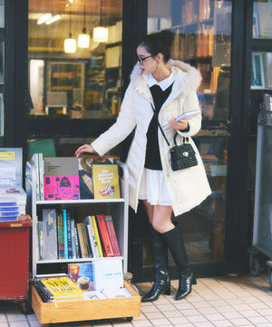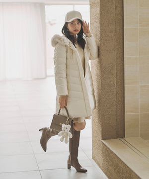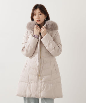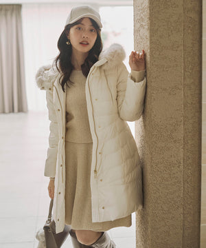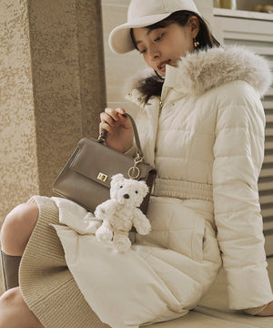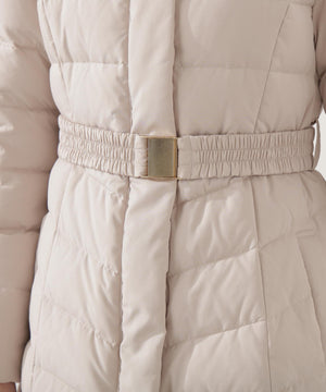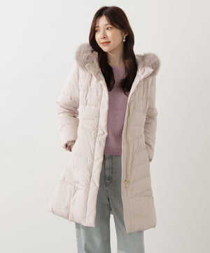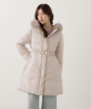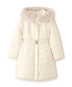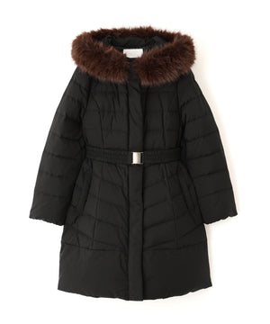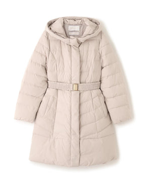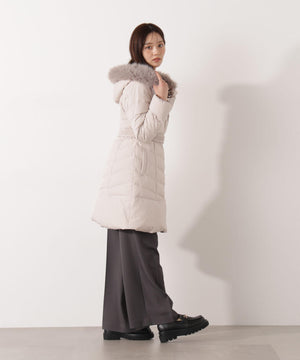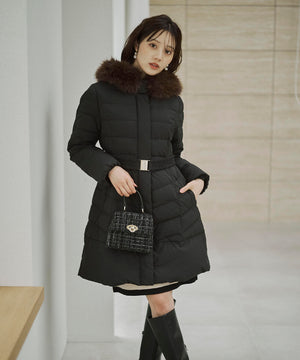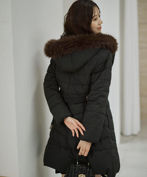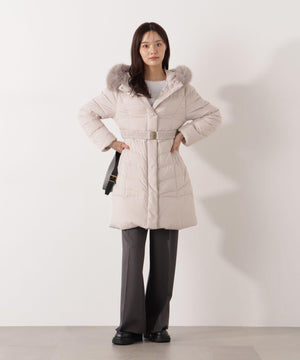 スタイルアップが叶うベルト付きダウンコート。付属のベルトでウエストマークすると、女性らしいシルエットを演出します。ウエスト下からVラインのステッチデザインが入り、より美しいシルエットを引き立てます。バックスタイルにも拘り、フードデザインが愛らしさをプラス。フードまわりのフェイクファーは取り外し出来ます。