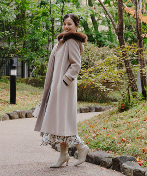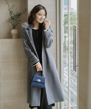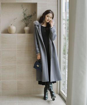 フェミニンにもカジュアルスタイルにも相性バツグンなフード付きロングコート。フードまわりのフェイクファーとフードは取り外し出来るので、気分に合わせて違うスタイルが楽しめます。後ろはウエストベルト付きで、視線を上げながらスタイルアップを期待。前立てはファスナー仕様で着脱しやすくなっています。ゆとりのある身幅ながら広がりを抑えたシルエットです。保温性の高い生地を使用しているので防寒対策もばっちり。モッサ加工をあしらった素材はしっかりとした生地ながら、軽くて動きやすさも特徴です。
