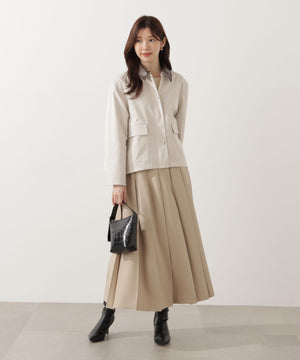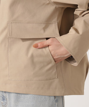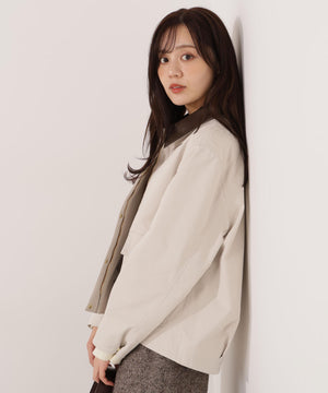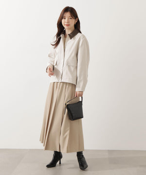 フェミニン派にも取り入れやすいようデザインされた、シャツジャケット型のカバーオールブルゾンです。襟にフェイクレザーを使用して秋冬ムードを演出。バックスタイルはコクーンシルエットで、柔らかな印象に見せてくれます。袖口のドット釦で調節が出来ます。