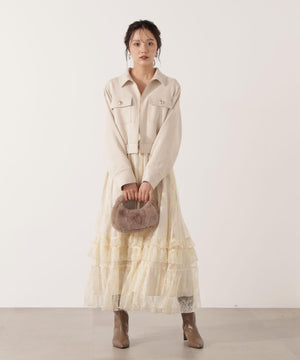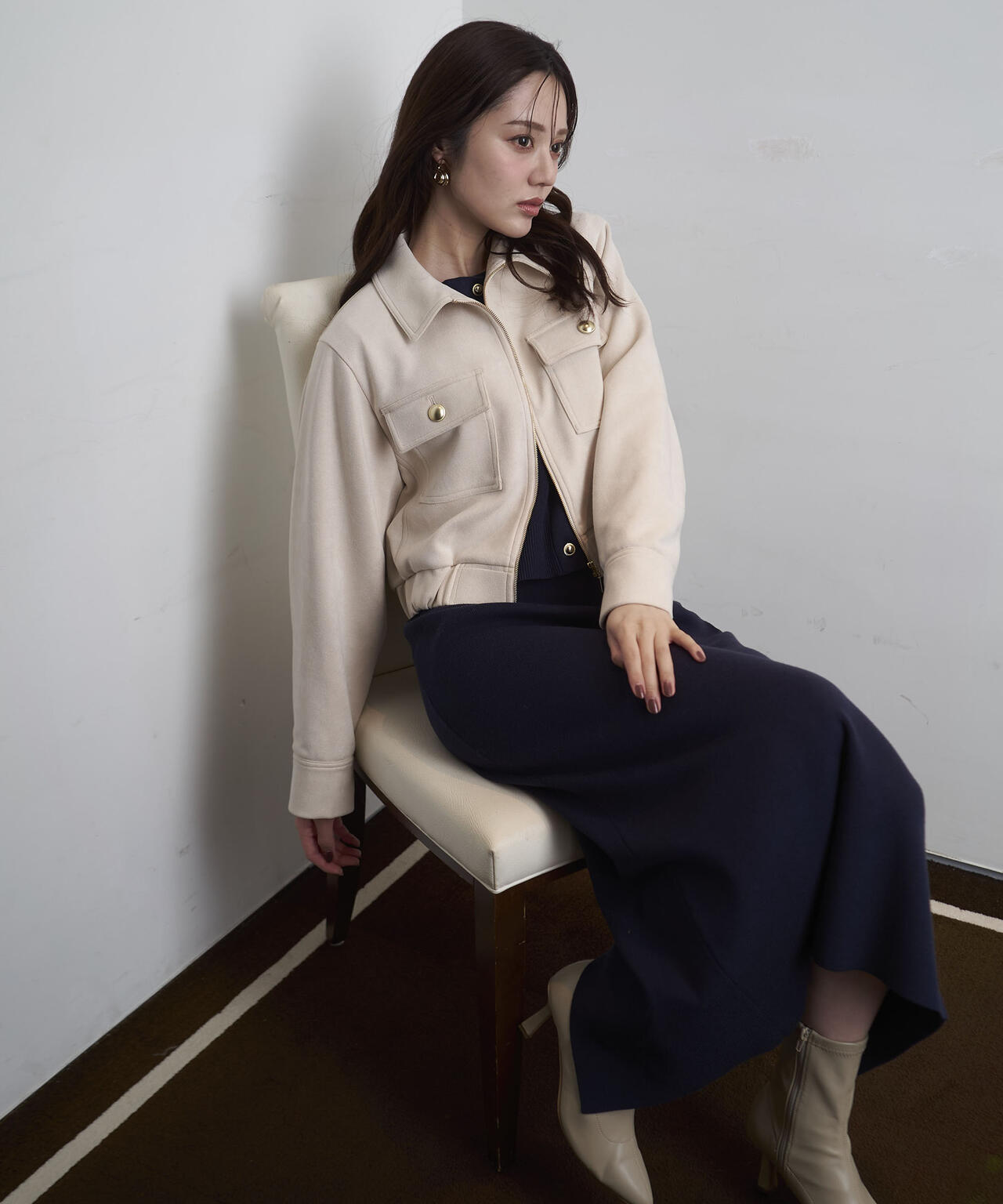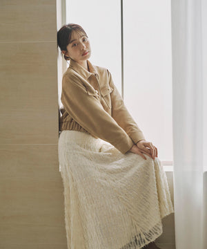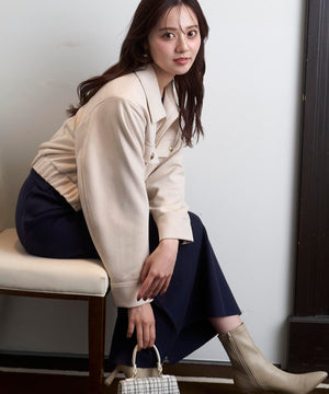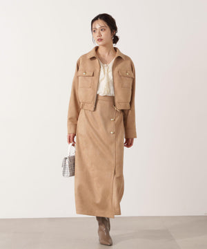 厚手ながら柔らかいダンボール素材を使用したフェイクスエードブルゾンです。ゴールドカラーの釦が女性らしいポイント。裾にゴムを入れているので立体的なフォルムが出て、抜け感を演出。裏地つきなので長い期間、着ていただけます。同素材のスカートとのセットアップスタイルもお勧めです。
