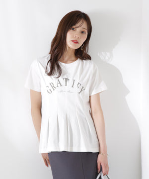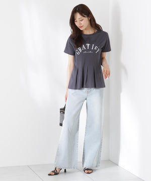 ナロースカートやパンツスタイルと好バランスなペプラムTシャツ。ウエストにタックを入れたペプラムシルエットでキレイめに着こなせます。※ロゴの意味 Gratify・満足させる、Rise above・困難を乗り越える、超越する