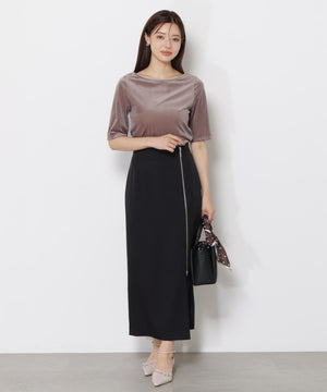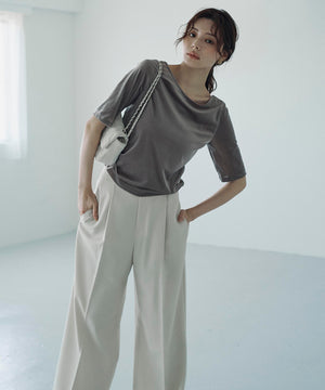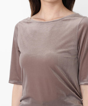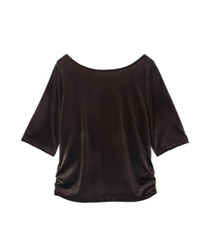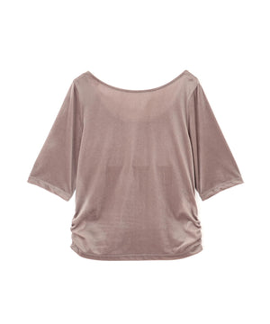 ほどよい透け感のあるシアーベロア素材を使用したカットソーです。バックスタイルが深く開いたデザインなので、シンプルなコーディネートでも女性らしく演出。脇はシャーリングを入れており、アウトスタイルでもポイントになります。
