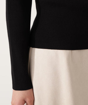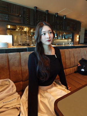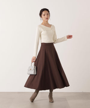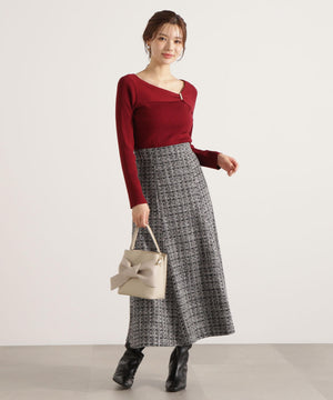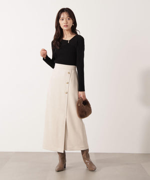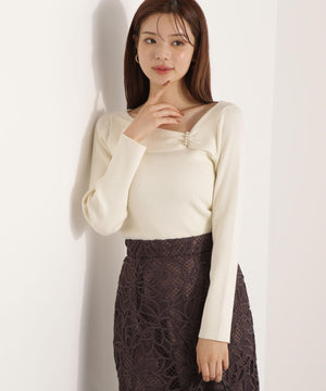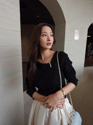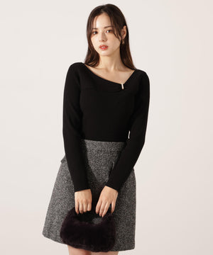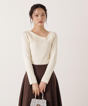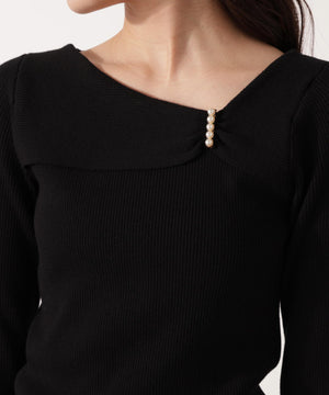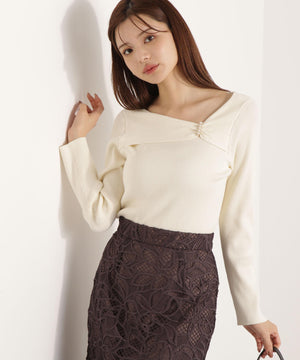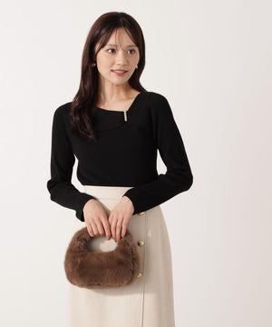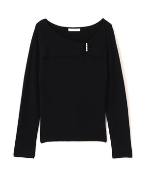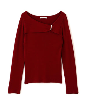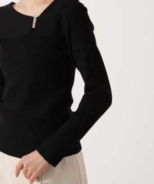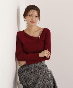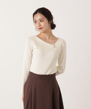 春にご好評いただいたアイテムを秋らしくアップデート!トレンドのアシンメトリーディテールを取り入れたニットです。今回はアシンメトリーな襟に、パール調を縦に並べたデザインで大人の華やかさを演出。デイリーにもお仕事シーンにも使えるデザインは、デニムパンツやキレイめスカートとも着回せます。