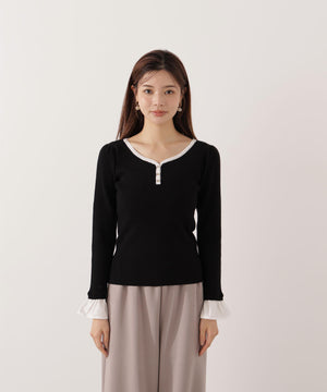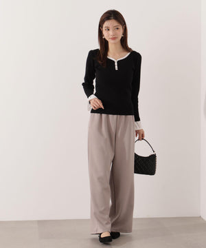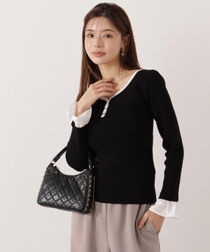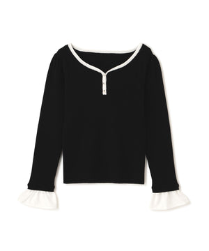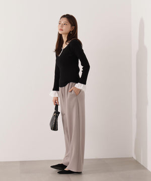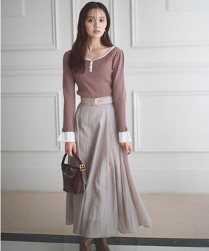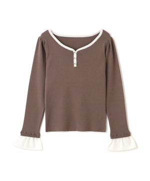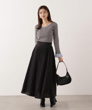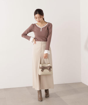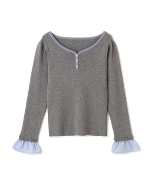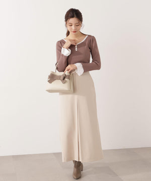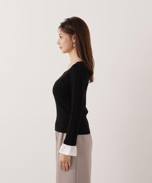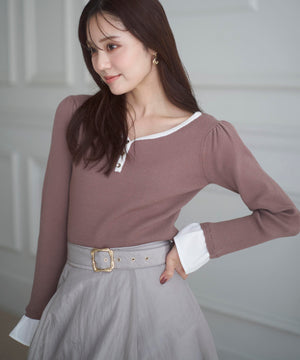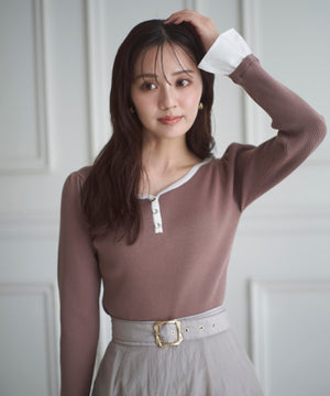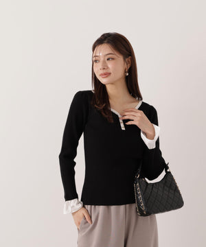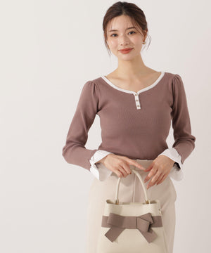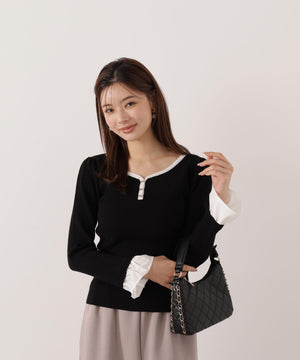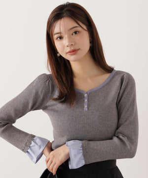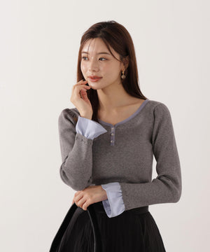 トレンドの異素材ドッキングニットです。フレアカフスがレイヤード見えするドッキングデザイン。襟ぐりと袖口をワントーンにまとめて統一感を出してます。フェミニンな雰囲気のハートネックとフロント釦もポイント。キレイめスカートやパンツ、カジュアルなデニム合わせもお勧めです。