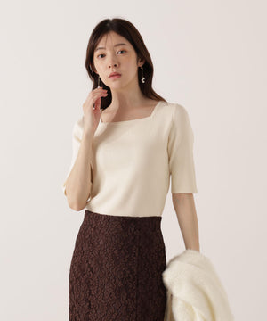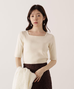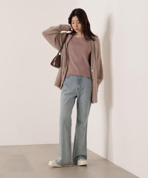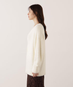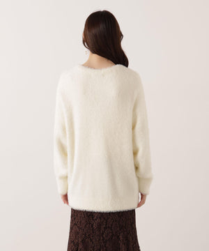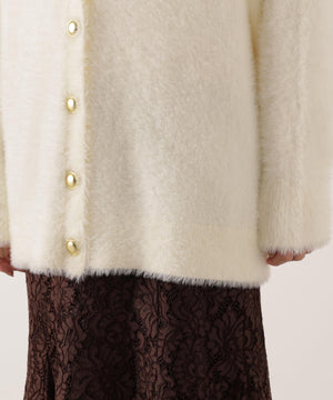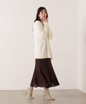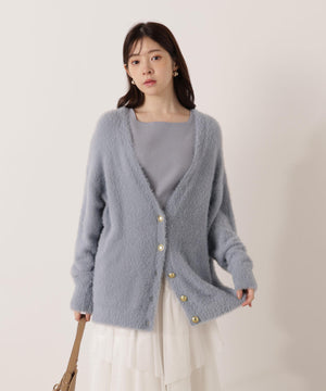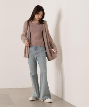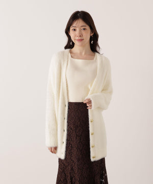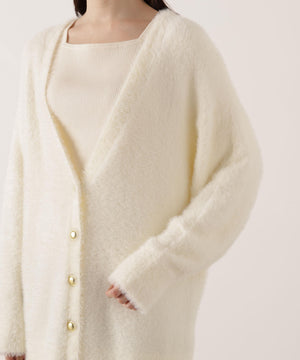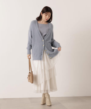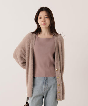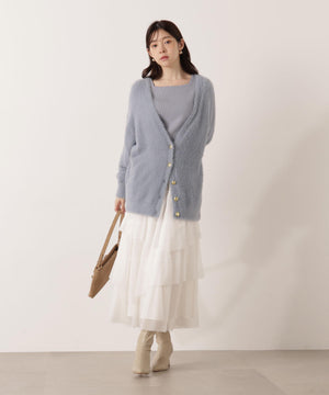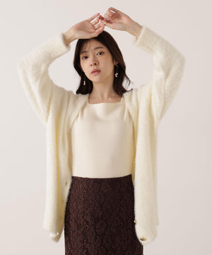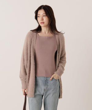 それぞれ単品使いが出来るシャギーロングカーディガンと5分袖リブニットのアンサンブル。シャギーカーディガンはふわふわ感を残しつつ、しっかりとした編地なので高見えします。インナーのスクエアネックリブニットは、5分袖なので春先まで長く着用いただけます。スカートやパンツスタイルはもちろん、カーディガンはワンピースとも相性バツグンです。