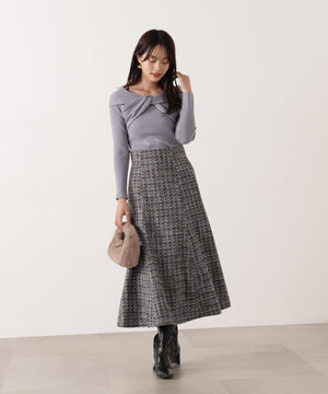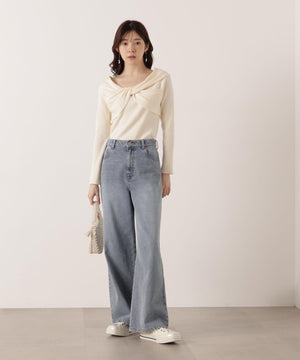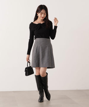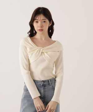 デコルテラインがキレイなオフショル見えニット。オフショル部分をひねって交差したリボン見えするデザインです。さり気ないデザインがデイリー使いにぴったり。スカートやパンツ、デニム合わせもフェミニンな雰囲気で着用いただけます。