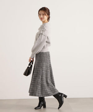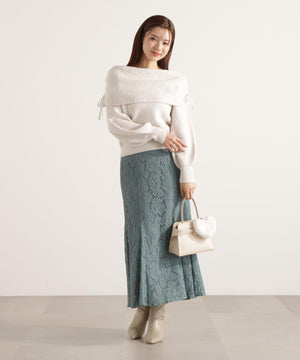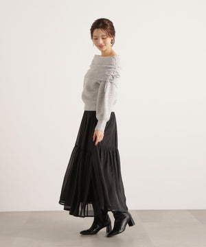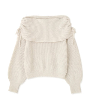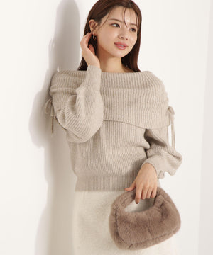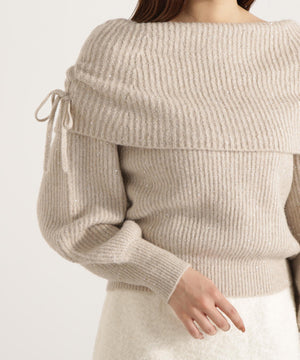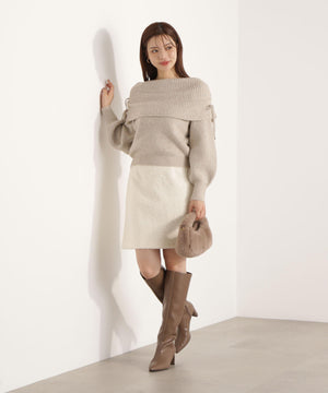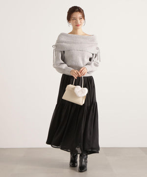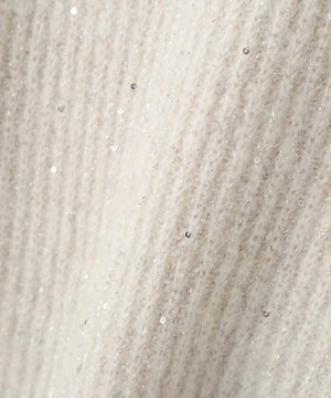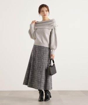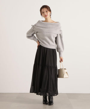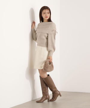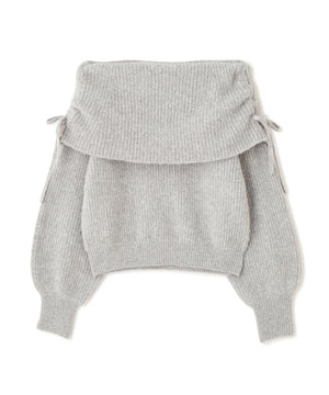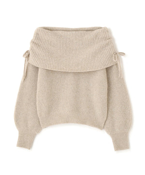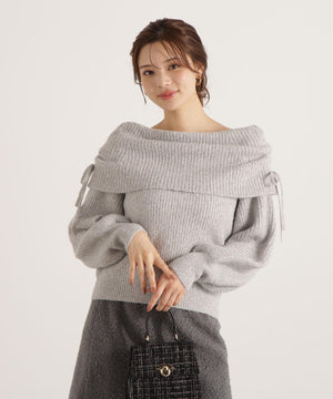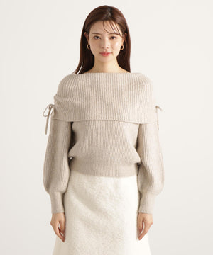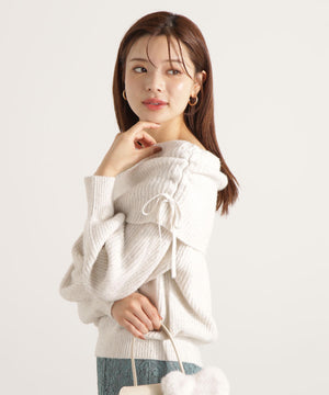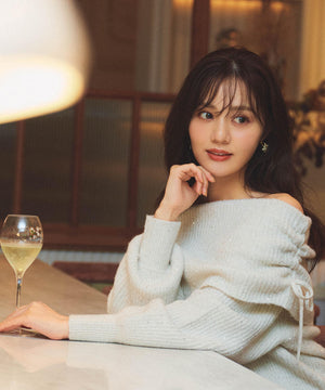 スパンコール入りのラメ糸を使用した華やかなオフショルニット。オフショル裏側のリボンを引っ張って結ぶと、自然なシャーリングになって愛らしいスタイリングが完成します。ミニ丈やロング丈のスカートと合わせた、大人フェミニンスタイルがお勧めです。