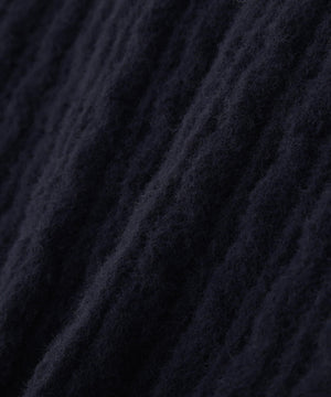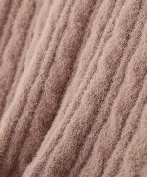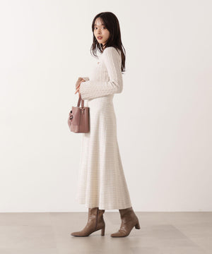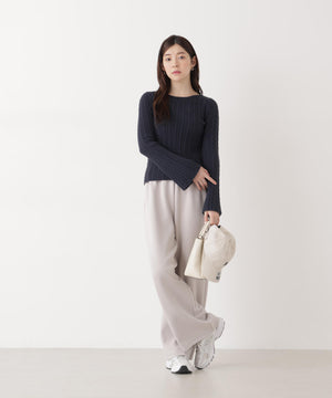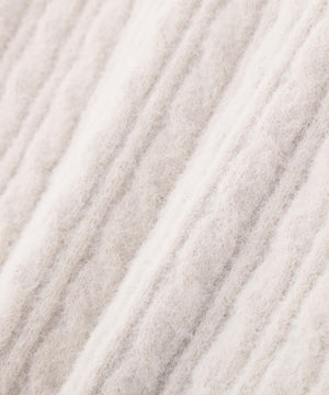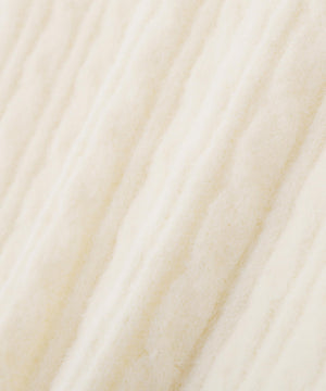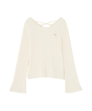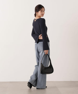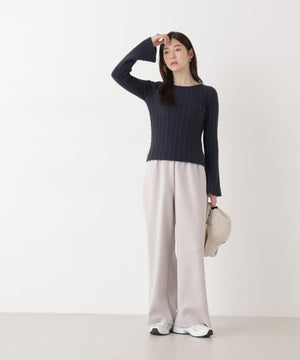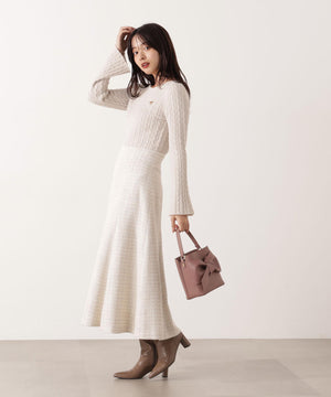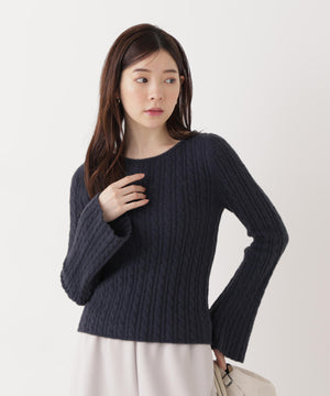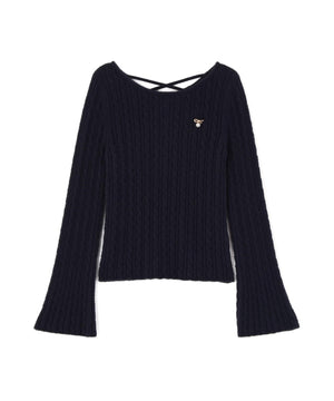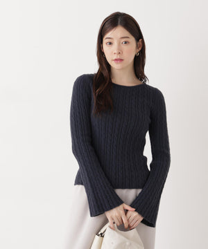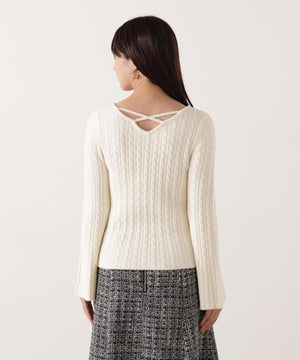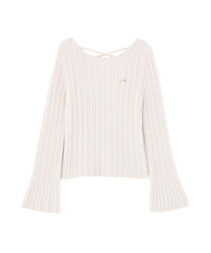 ショートフェザー糸を使用した冬らしいミニケーブルニット。もっちりふわふわな糸を使ったミニケーブル柄とパール調チャームがポイントです。袖はフレアスリーブ、後ろネックはレースアップデザインにして、よりフェミニンな雰囲気を叶えるデザインです。