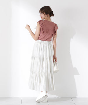 複数の透かし編みをボーダー状に表現した涼しげなニットです。小さめの柄編みや、肩先にそっとかかるショルダーフリルが女性らしく、デイリーに着こなしやすいデザイン。ショルダーフリルは黒とホワイトはバイカラーにし、ピンクはワントーンで仕上げています。スカートもデニムパンツ合わせもお勧めです。
