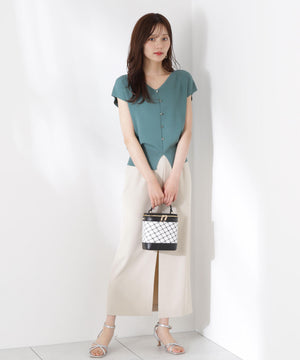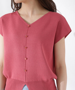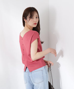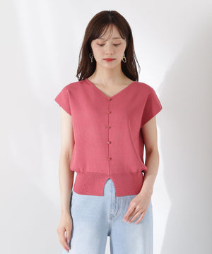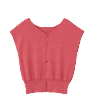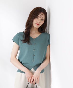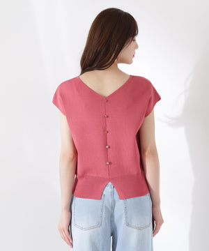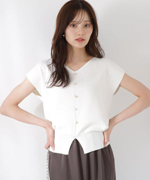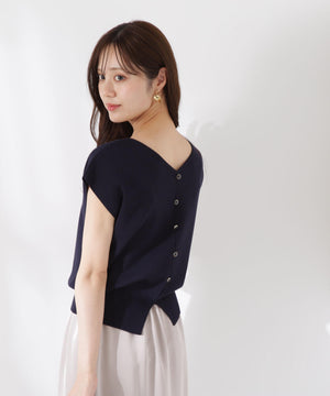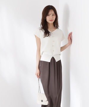 前後どちらを前にしても着られる2wayデザインのニットです。プルオーバーとしても、キラキラ釦が愛らしいカーディガン風にも着られるデザイン。キラキラ釦が付いている面は、裾にスリットが入っているため、ウエストアウトで着こなすがおすすめです。