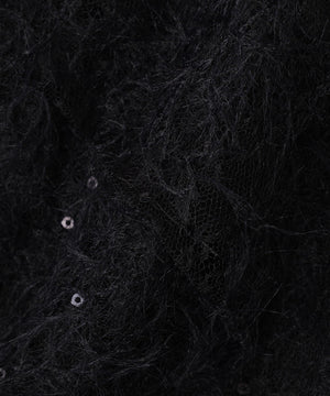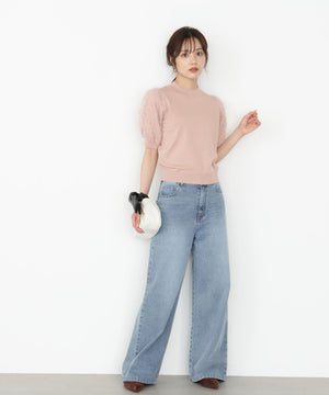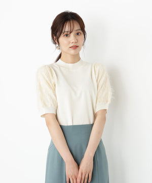 袖に起毛レースをドッキングしたキャッチーなニットです。袖と身頃はワントーンでまとめながらも華やかな印象です。アームホールにパイピングが入り、起毛レースが肌に当たりにくい仕様です。スカート合わせでフェミニンにも、デニム合わせでカジュアルダウンにも着回せます。