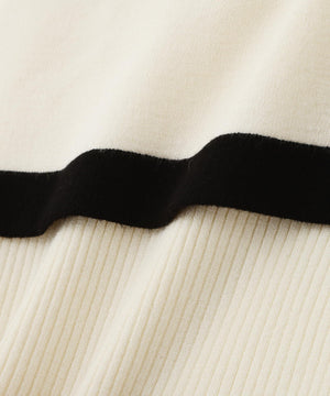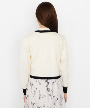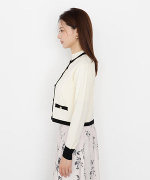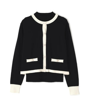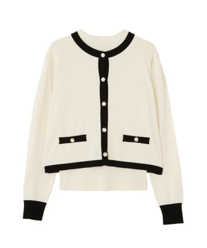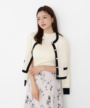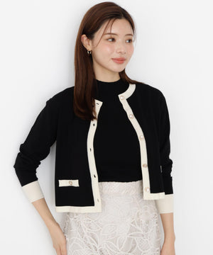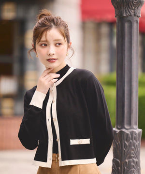 配色が目を引くニットアンサンブルです。インナーは5分袖なのでこれからの季節、長く着られるデザイン。カーディガンはゴールドカラー釦がコーディネートのポイントになります。合わせるボトムス次第で、キレイめにもカジュアルにも着回せます。