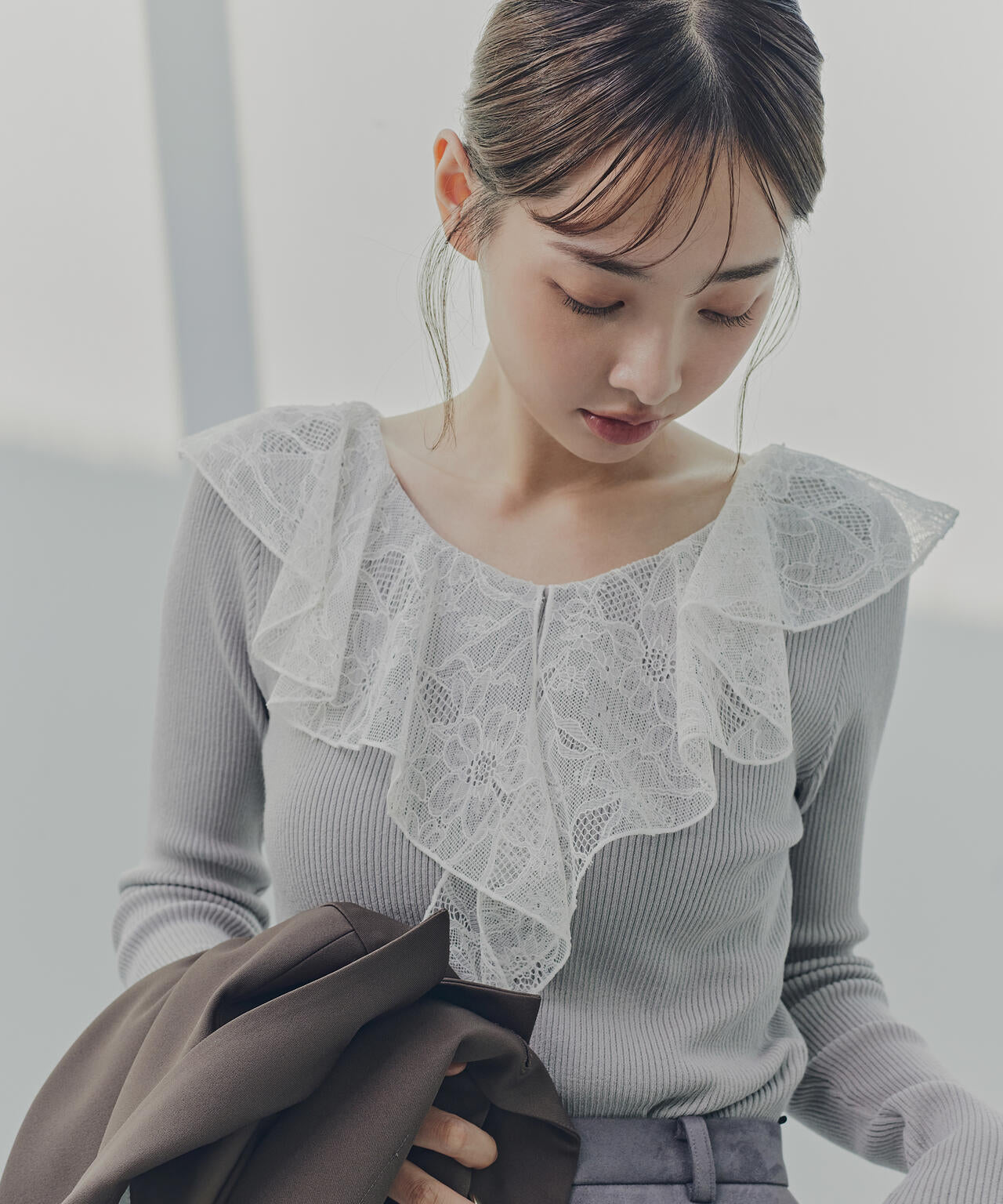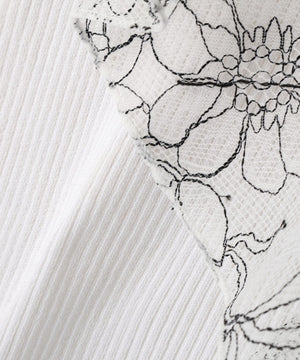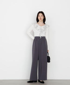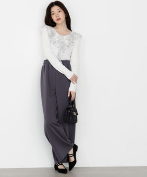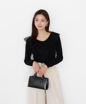 顔まわりを華やかに見せてくれる胸元のラッフルレースがポイントのリブニット。身頃はシンプルなのでウエストインしやすいシルエットです。キレイめスカートやパンツ、カジュアルなデニムパンツとも着回せます。色によってラッフルレースの配色が異なります。