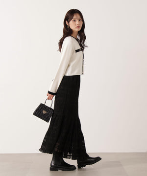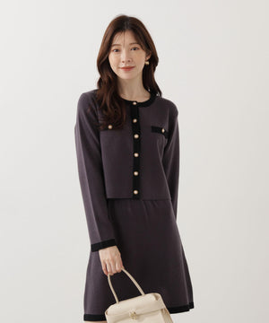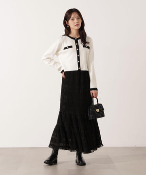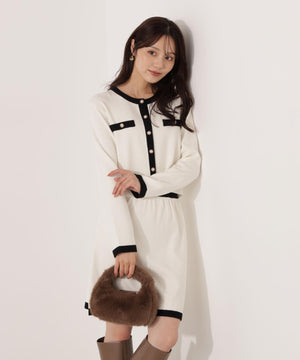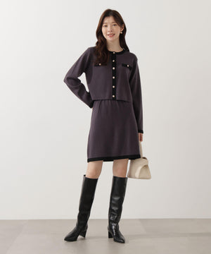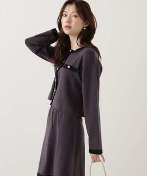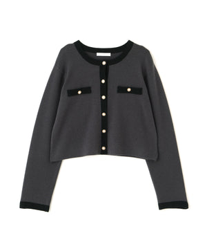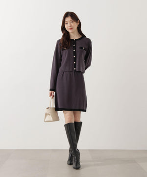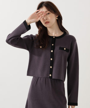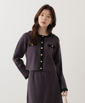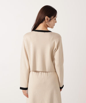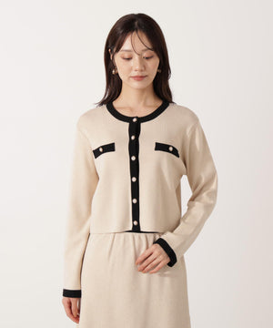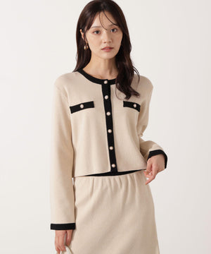 配色ラインが目を引くニットジャケットです。ゴールドカラーで縁取ったパール調ボタンが上品な印象をプラス。スカートはもちろん、デニムパンツと合わせた、カジュアルなコーディネートでも女性らしい雰囲気で着回せます。同素材のニットスカートとのSETUPスタイルもお勧めです。