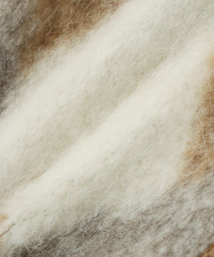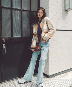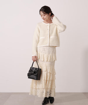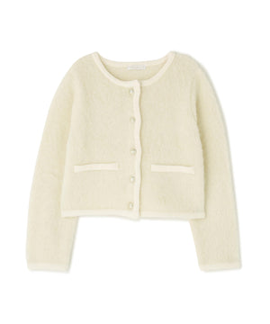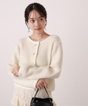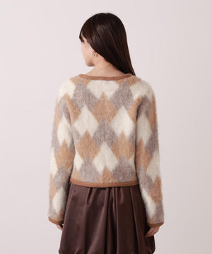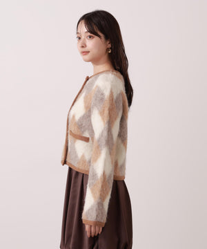 ジャケットのようにきちんと見えするシャギーニットです。襟から前立て、袖口や裾に縁取ったブレードが品の良いデザインで、トップス風に着こなすのがおすすめ。冬に映えるアイボリーとトレンドのアーガイル柄ベージュの2色展開です。