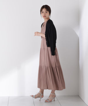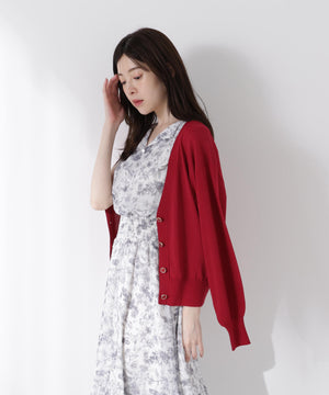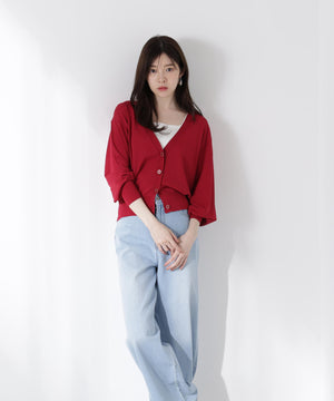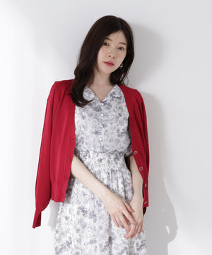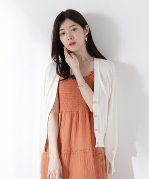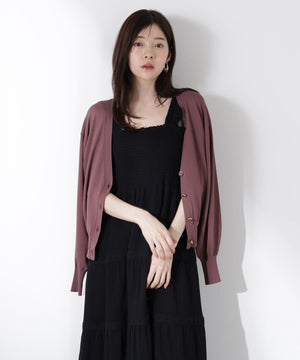 さりげない透け感が涼しげなベーシックカーディガンです。金色に縁取られたボタンがコーディネートにツヤ感をプラス。春夏スタイルの羽織にぴったりな風合いは、程よいVネックデザインも相まって、インナーを選ばずに着ていただけます。