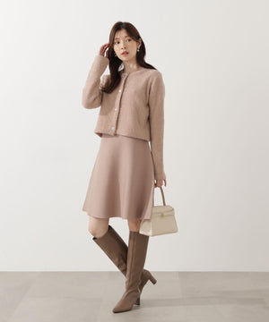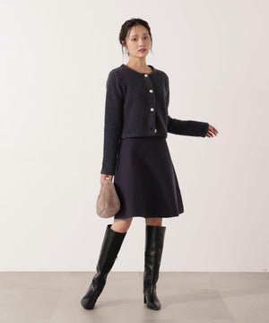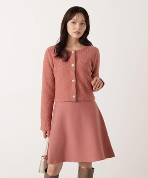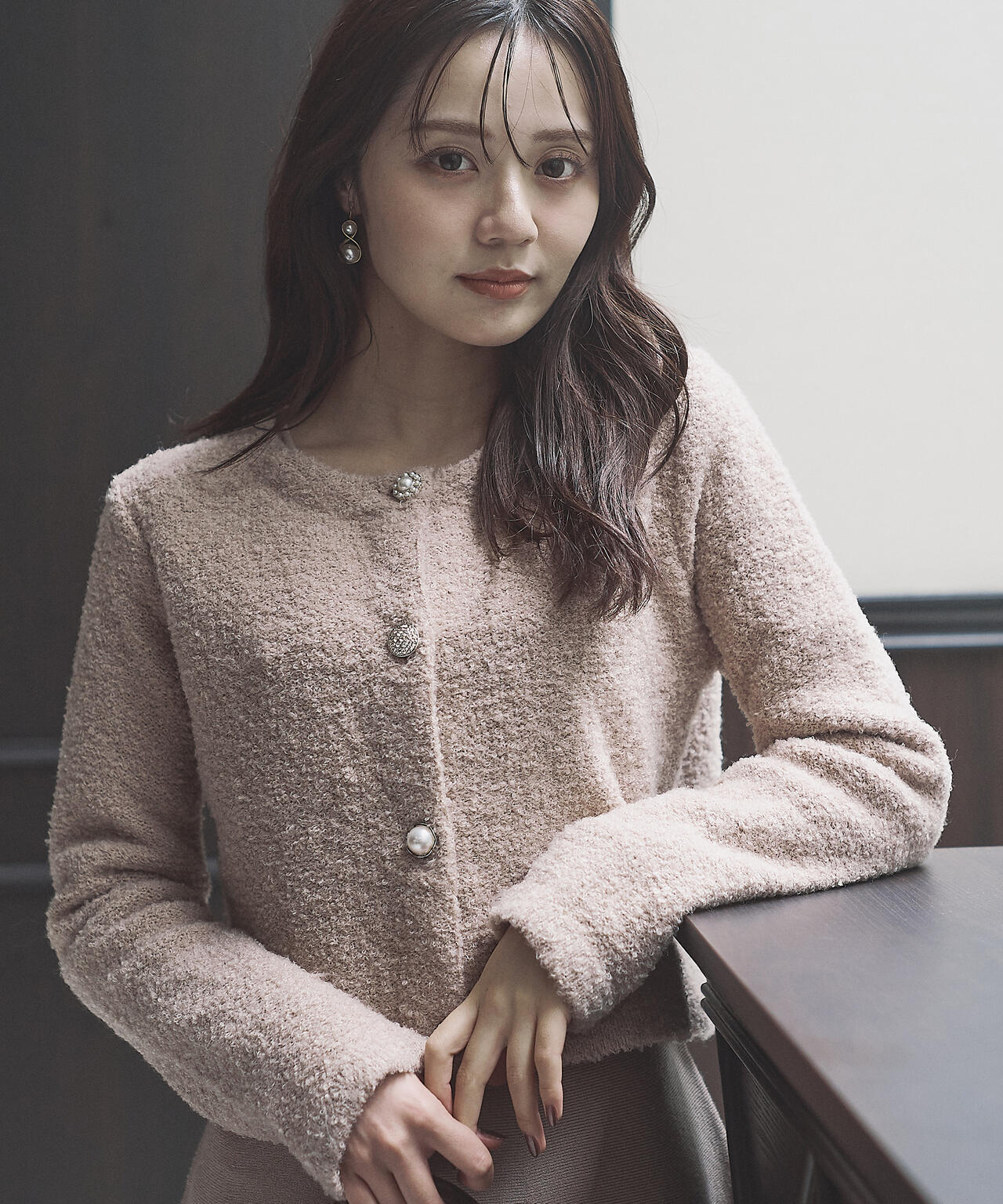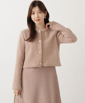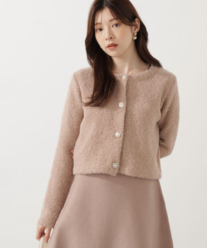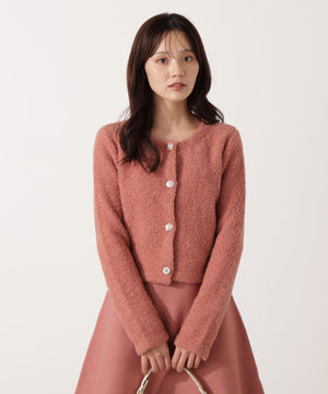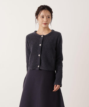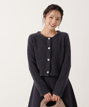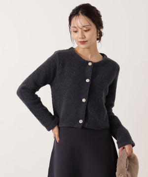 キラキラとした異なる釦をあしらったショート丈のカーディガンです。羽織りにも、前ボタンを留めてプルオーバー風にも着回せるデザイン。プリーツスカート合わせや、総針ニットミニワンピース(店舗商品番号121-5247003)と色を揃えたコーディネートもお勧めです。