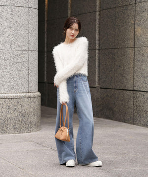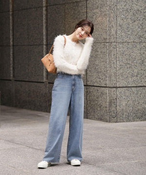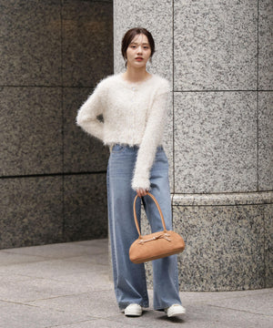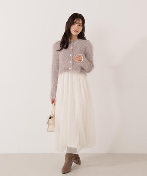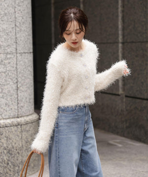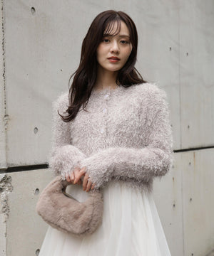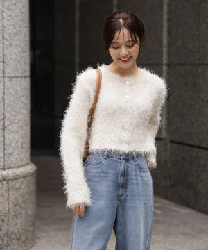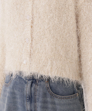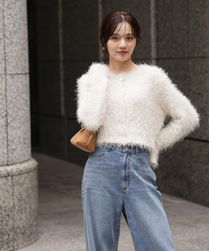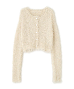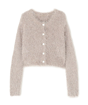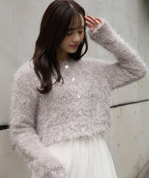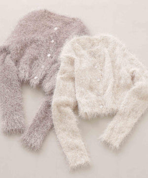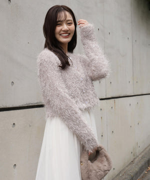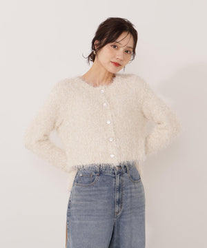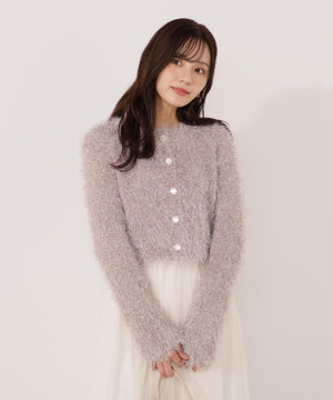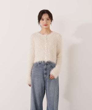 キラキラとした毛足のあるニットカーディガン。ざっくりとしたシルエットが愛らしく、一枚で華やかな印象を与えてくれます。柔らかな風合いが心地よく、前ボタンを留めるとプルオーバーとしても活躍。デイリーからお出かけシーンまで着回せます。