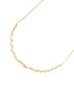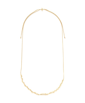 トップでチェーンが絡まるディテールが洗練された印象のチョーカーネックレス。エンドパーツのチェーン先をスライドすると長さ調節できるため、金具を留めずに装着できる仕様です。長さをアレンジしながら、その日のコーディネートに合わせてポイント使いが出来ます。