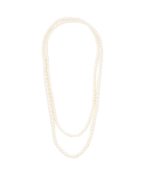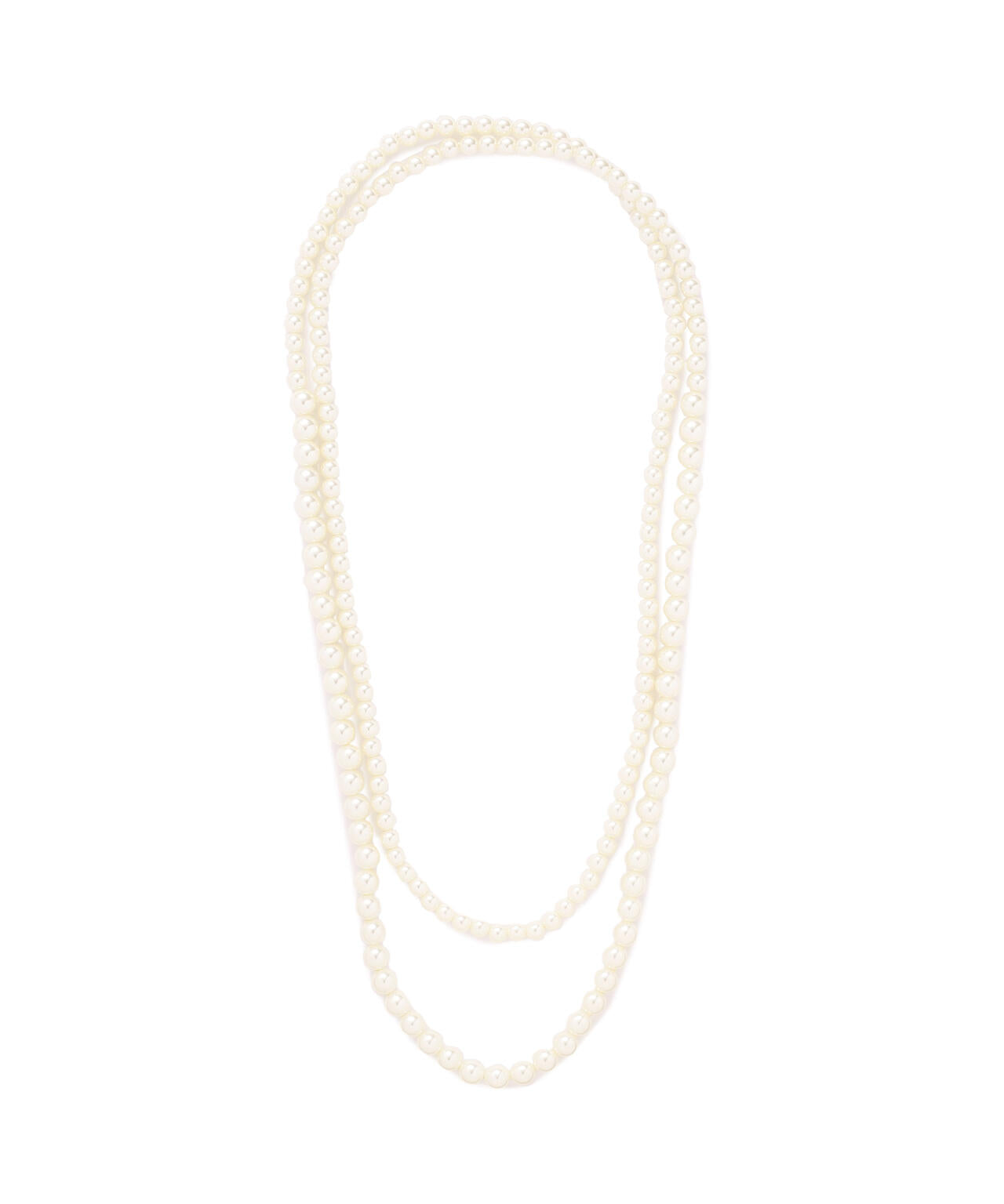 華やかなパール調ネックレス。長さのあるネックレスを2重巻きにして使えるデザインです。パール調はデイリーにもフォーマルなシーンにもロングシーズン合わせやすいアクセサリーです。