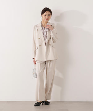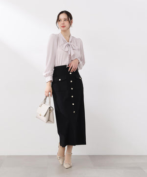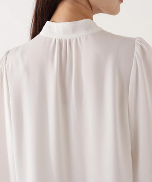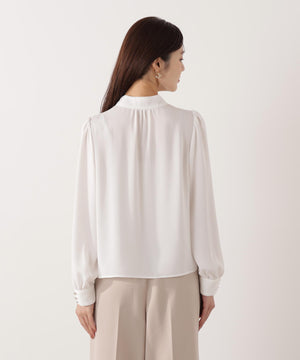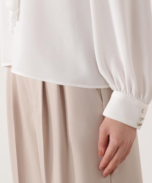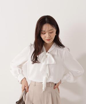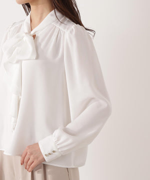 トレンドのラッフルをリボンタイにした華やかブラウス。顔まわりを柔らかい印象に見せてくれるラッフルリボンが映えるデザインは、オフィスシーンからデイリーまでおすすめ。肩のギャザー、カフスの飾り釦もアクセントになっています。パンツ・スカートはもちろん、スーツスタイルにも着回せます。