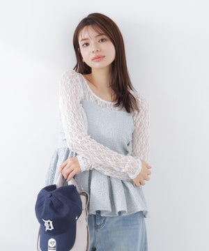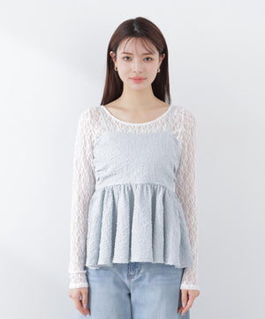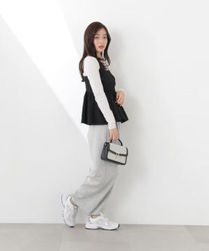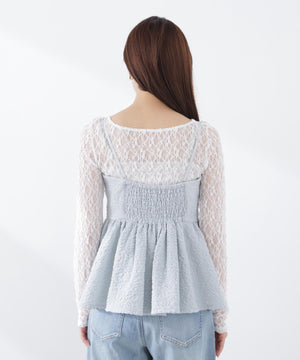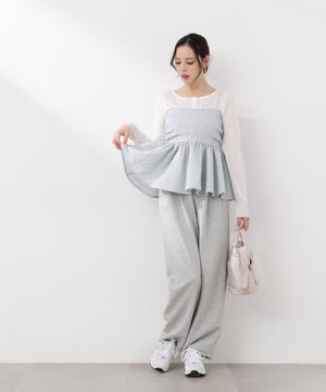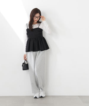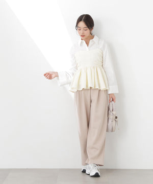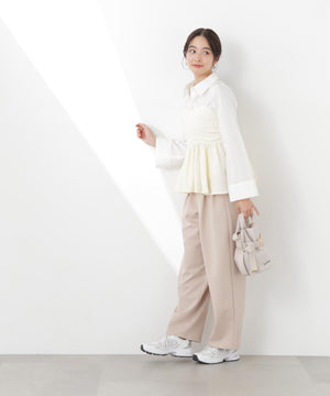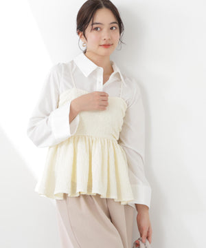 ペプラムシルエットが柔らかな印象を与え、腰まわりをさり気なくカバーするビスチェ。膨れジャガード素材で抜け感があり、アウトスタイルが様になるデザインです。背中はシャーリングゴム仕様でフィット。肩紐は長さ調節ができ、レイヤードスタイルを楽しめます。