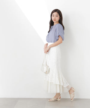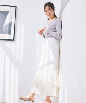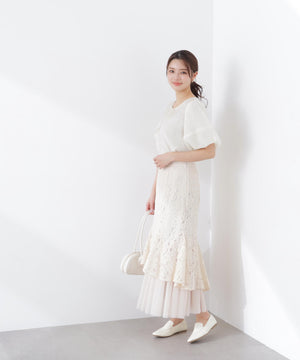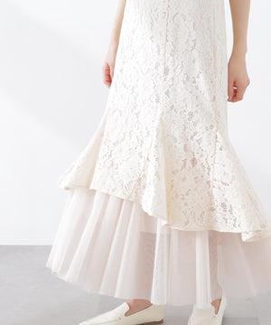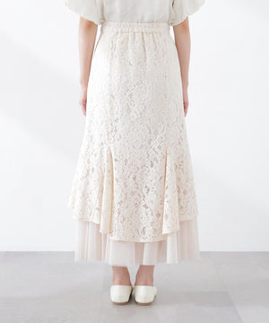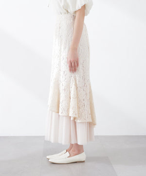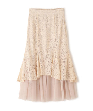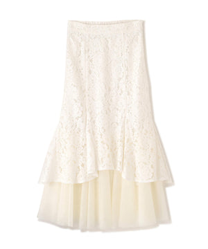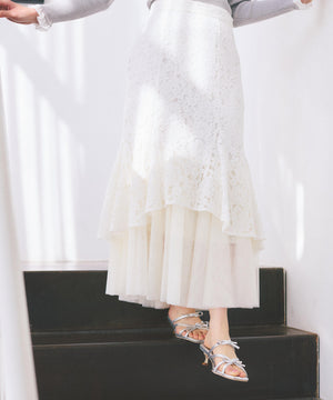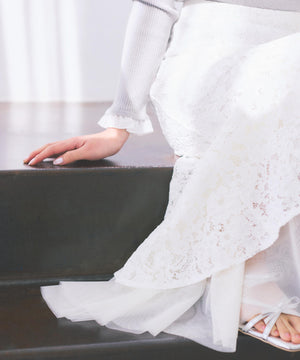 レース×チュールの異素材マーメイドスカート。素材のコントラストで立体感と華やかさを叶えてくれます。後ろウエストはゴム仕様でフィット。コーディネートの主役になり、シンプルなトップスと合わせるだけでおしゃれな雰囲気に見せてくれます。